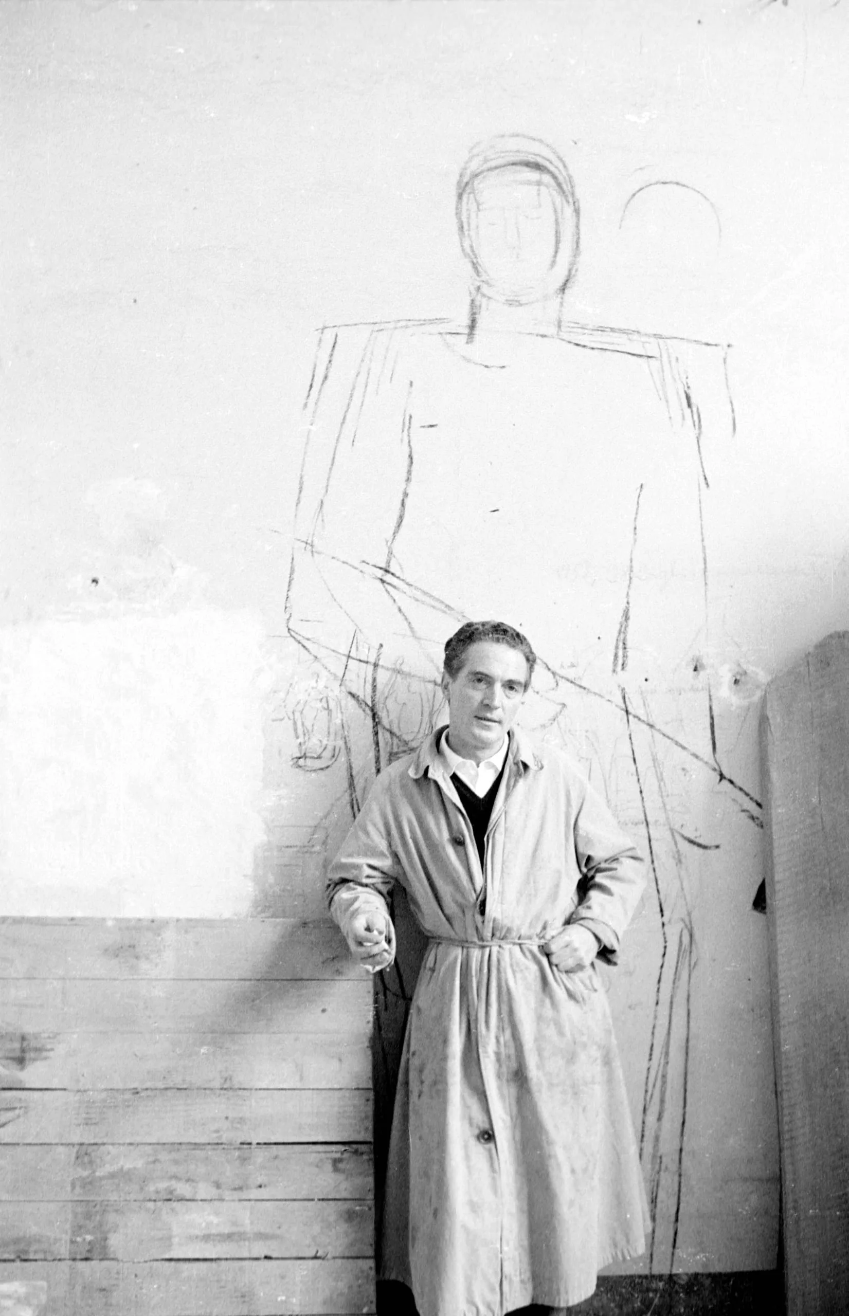 Black and white photograph of a man in a belted trench coat standing before a wall with a large chalk figure sketched behind him