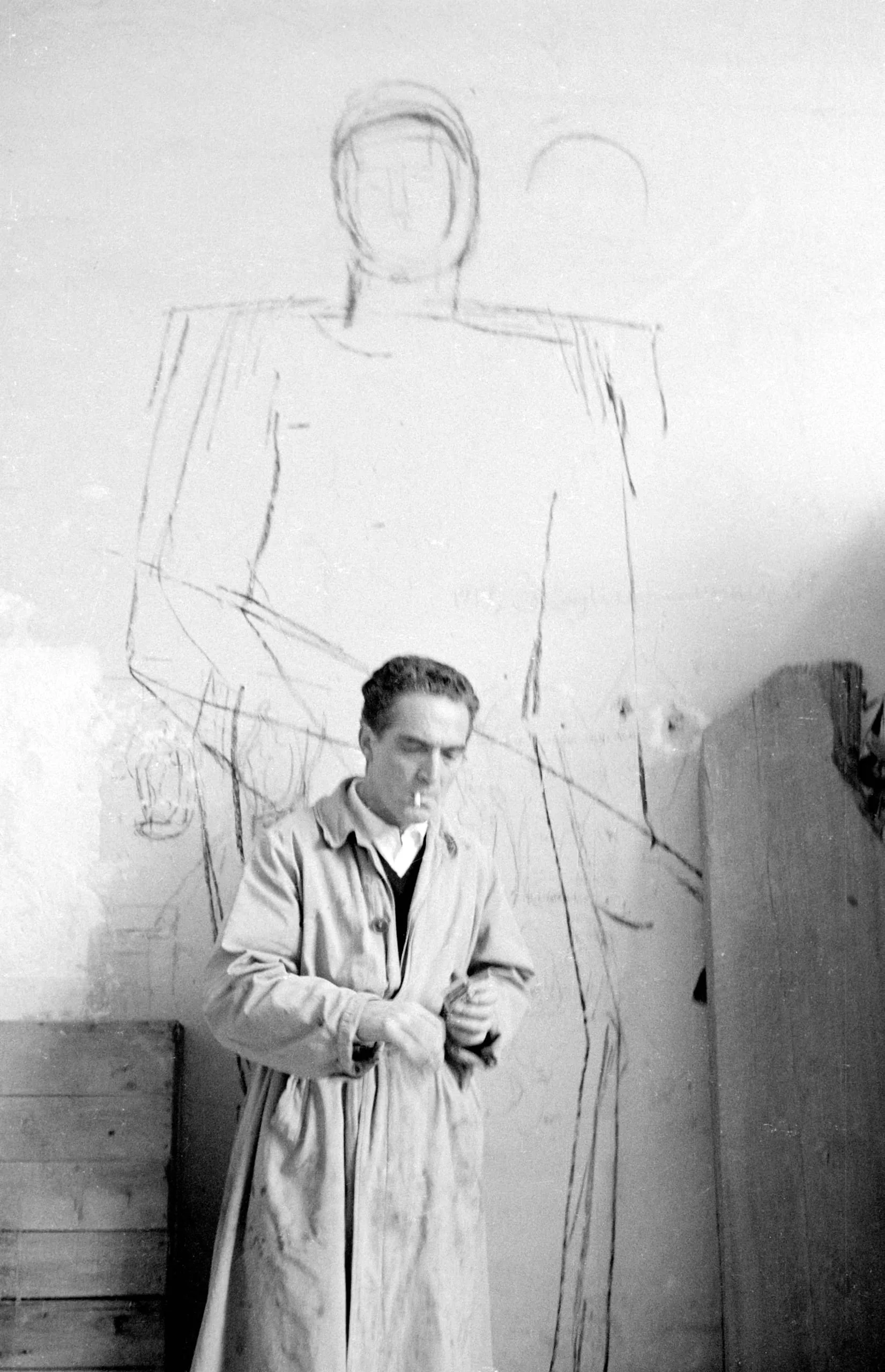 Black and white photograph of a man in a work coat standing before a wall with a large charcoal figure sketch drawn directly on the plaster