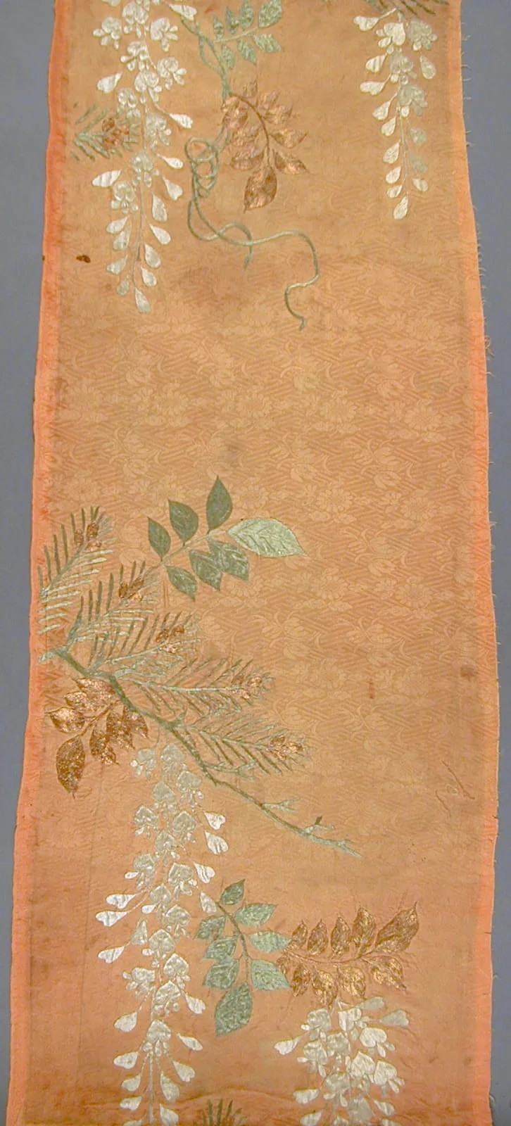 - Silk figured satin (rinzu), with silk and gilt-paper-wrapped-silk-thread embroidery