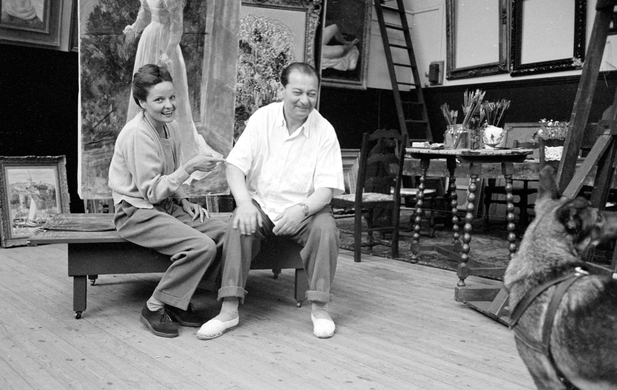 Black and white photograph of a woman and man seated on a low bench in a painter's studio, surrounded by large canvases, laughing mid-conversation