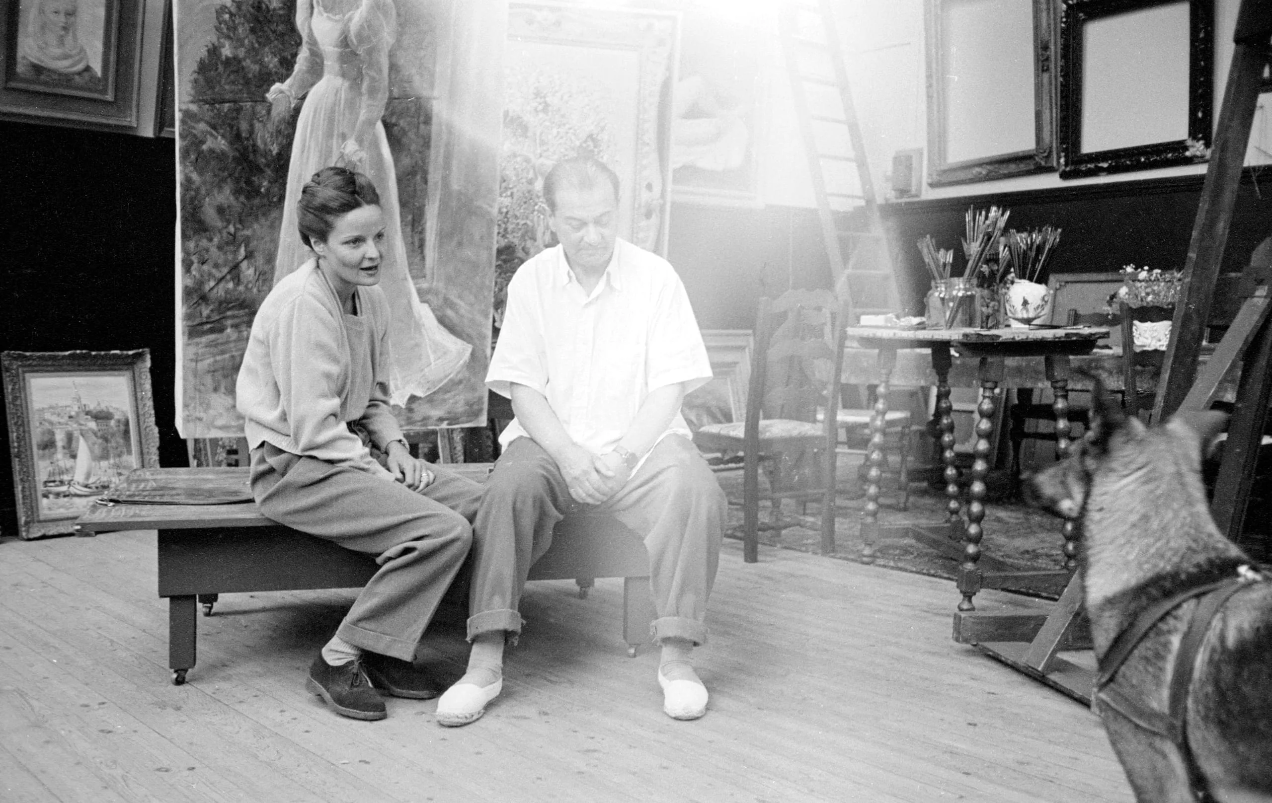 Black and white photograph of a woman and older man seated in an artist's studio surrounded by paintings, easels, and art supplies, with a dog partially visible at lower right