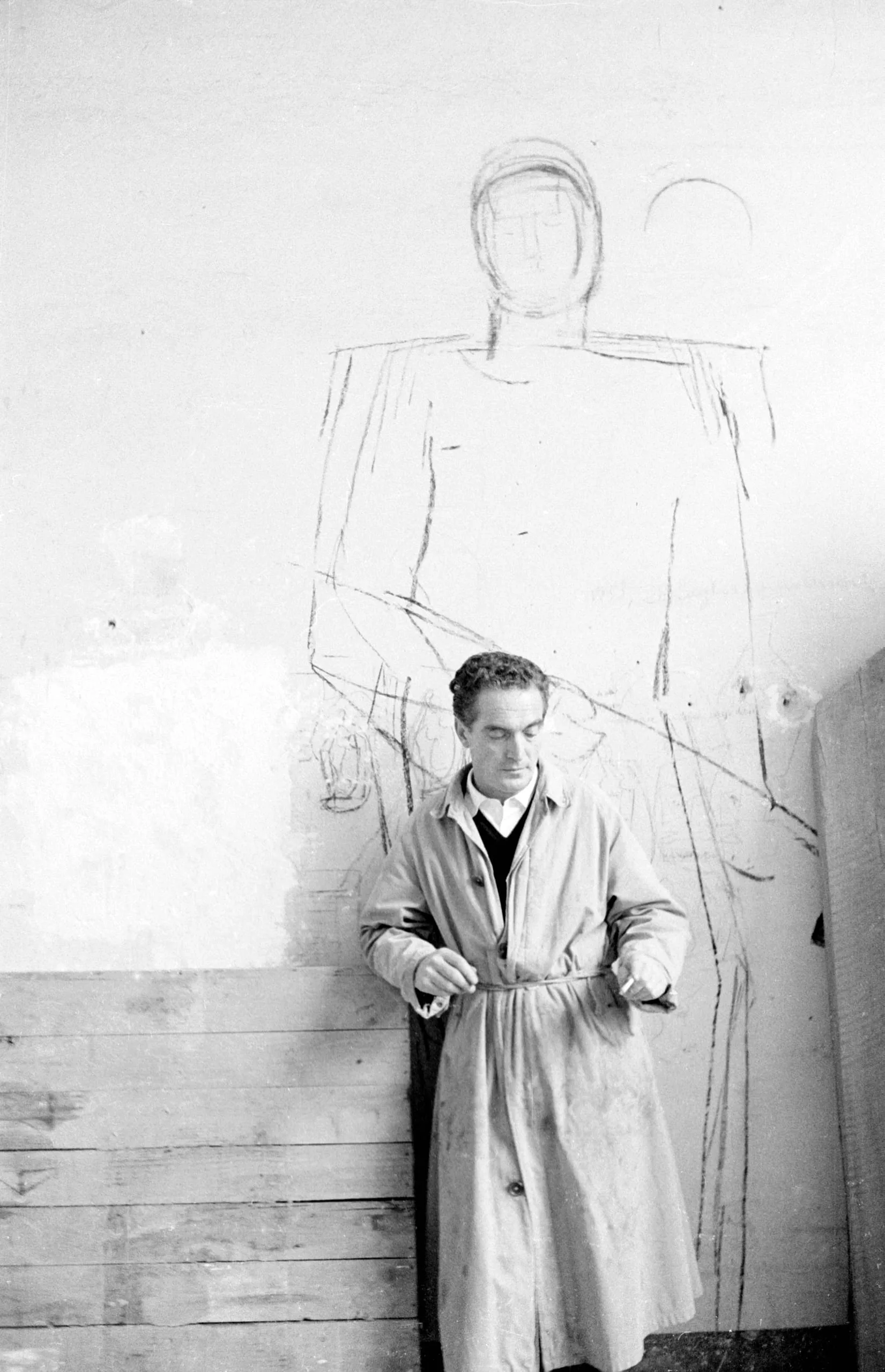 Black and white photograph of a man in a trench coat standing before a white wall with a large, loosely sketched human figure drawn directly on the plaster behind him