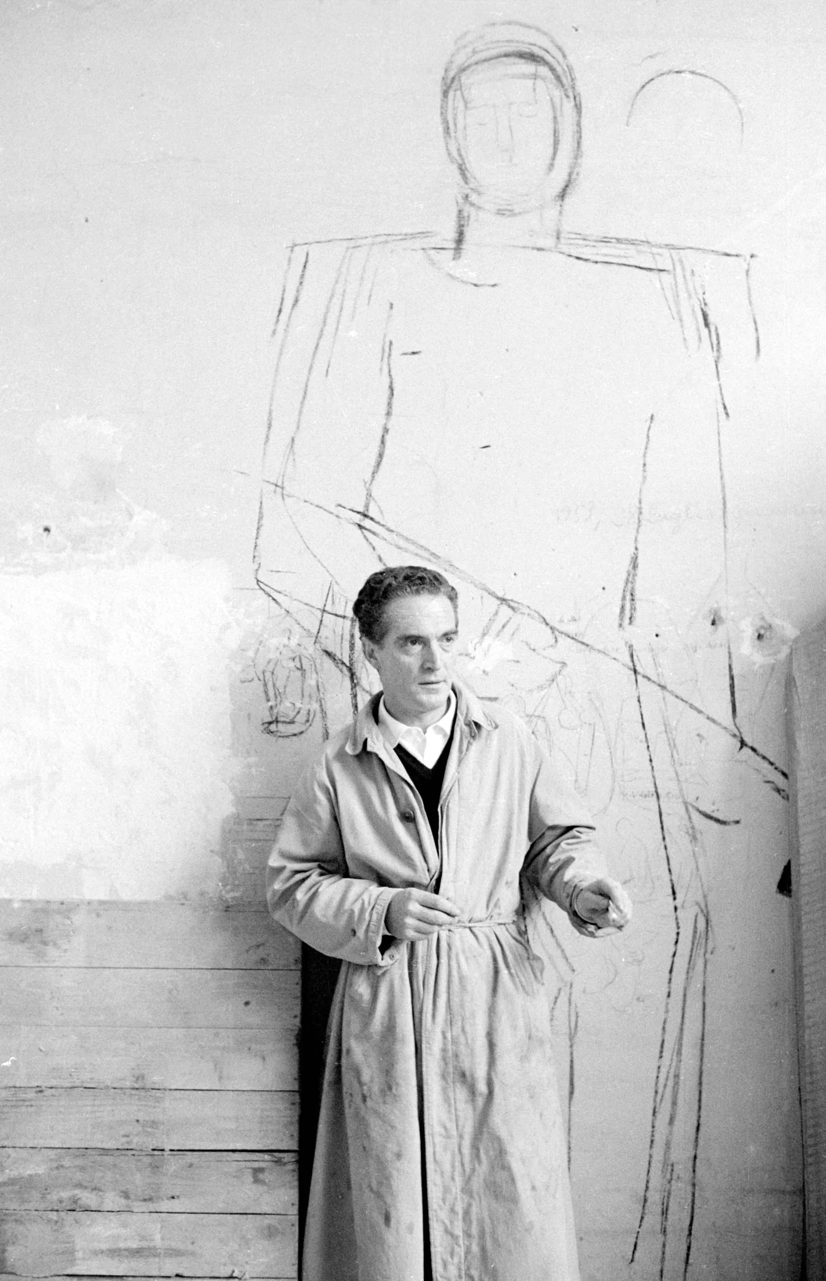 Black and white photograph of a man in a belted trench coat standing before a plaster wall covered with large chalk figure sketches