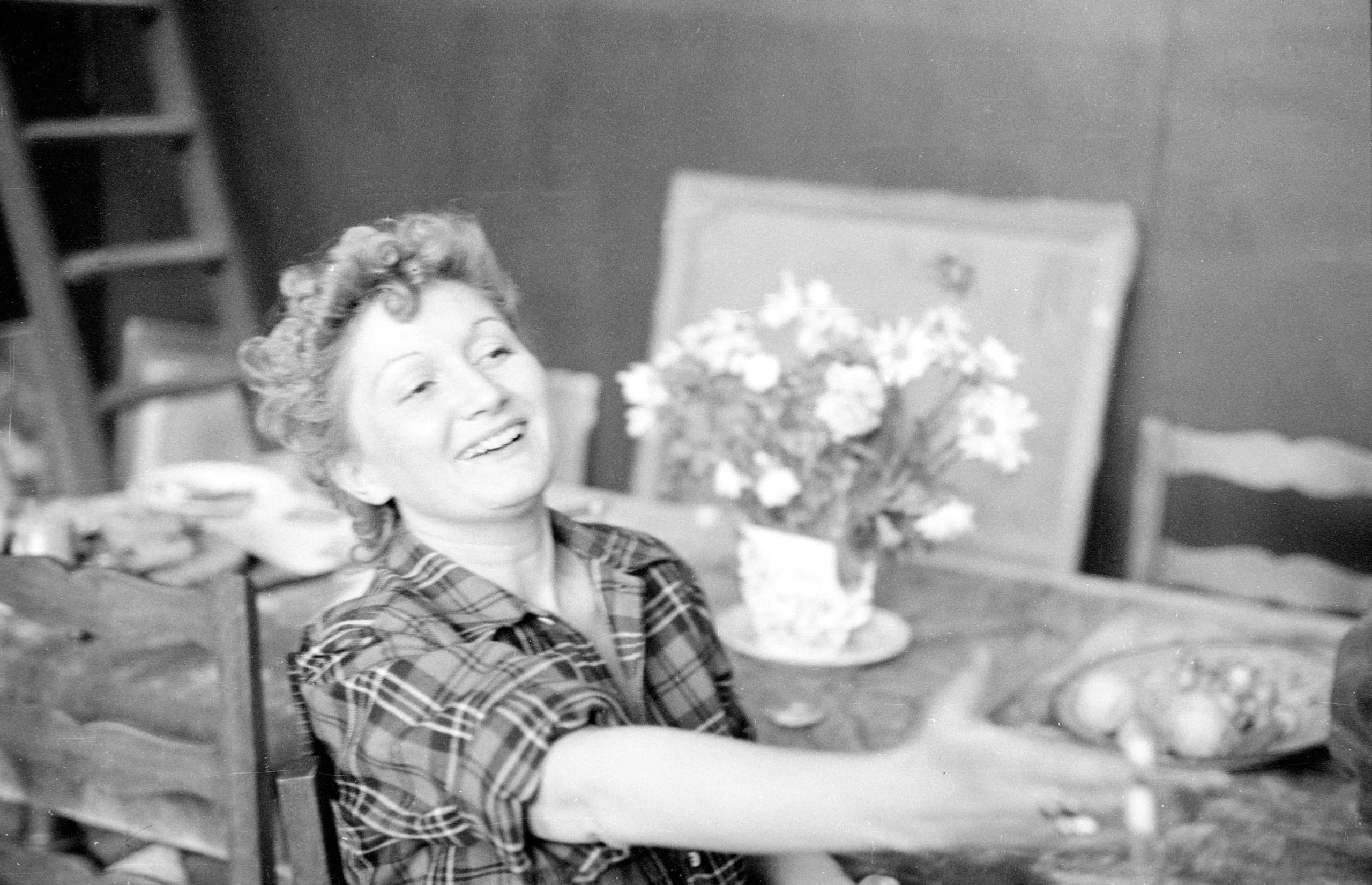 Black and white photograph of a curly-haired woman in a plaid shirt, leaning back with mouth open in laughter, arm outstretched across a wooden table with flowers and fruit