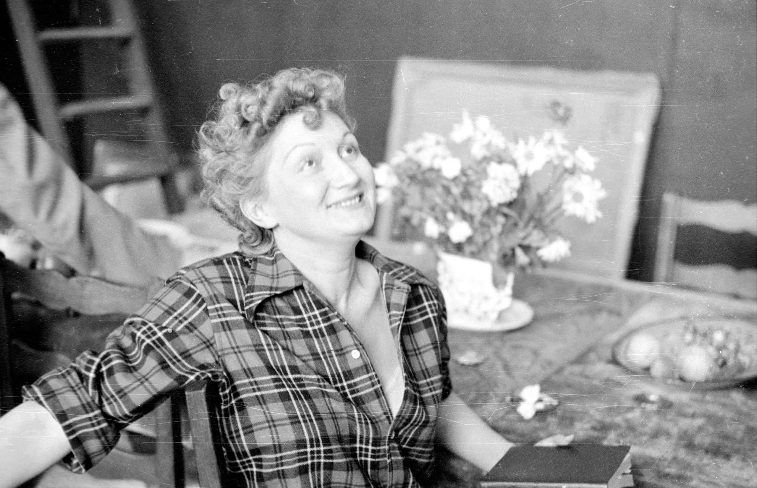 Black and white photograph of a smiling white woman with curly hair and hair rollers, seated at a table wearing a plaid shirt, with a flower vase behind her