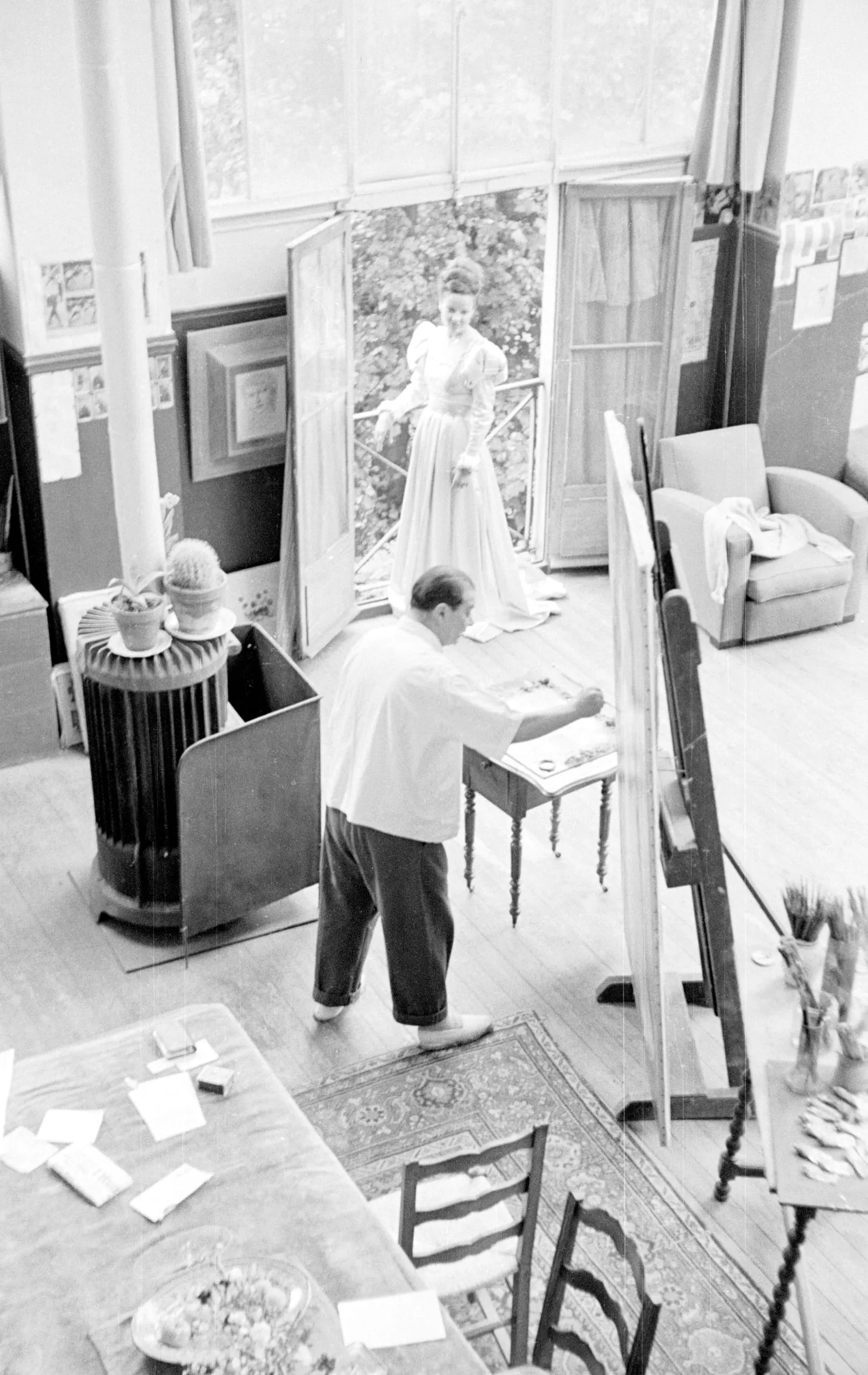 Black and white photograph taken from above, showing an artist's studio with a man in a white shirt leaning over a worktable and a woman in a long gown standing on a balcony beyond tall windows