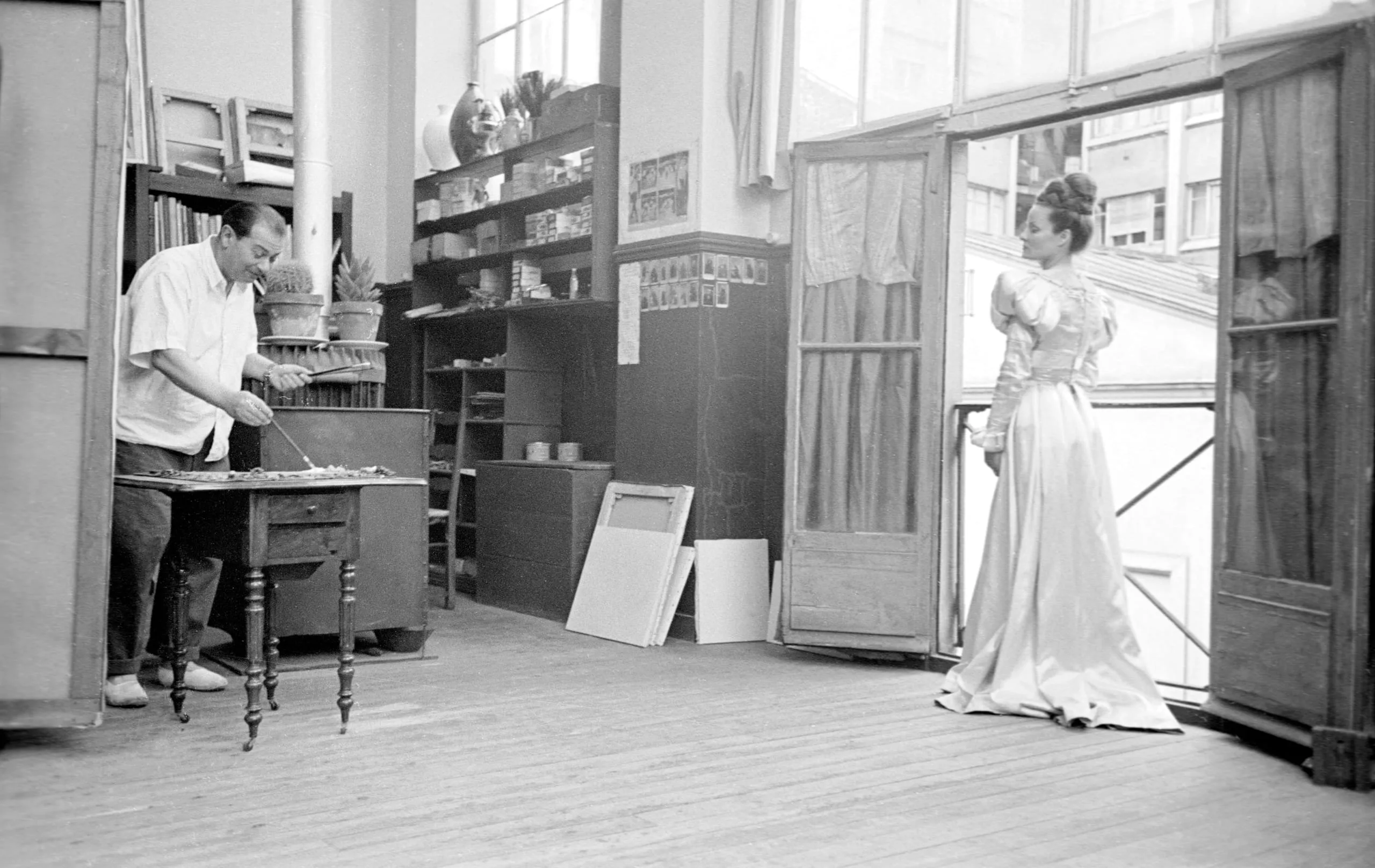 Black and white photograph of two figures in a large studio interior: a man leaning over a worktable on the left, a woman in a full-length Victorian-style gown standing near open doors on the right