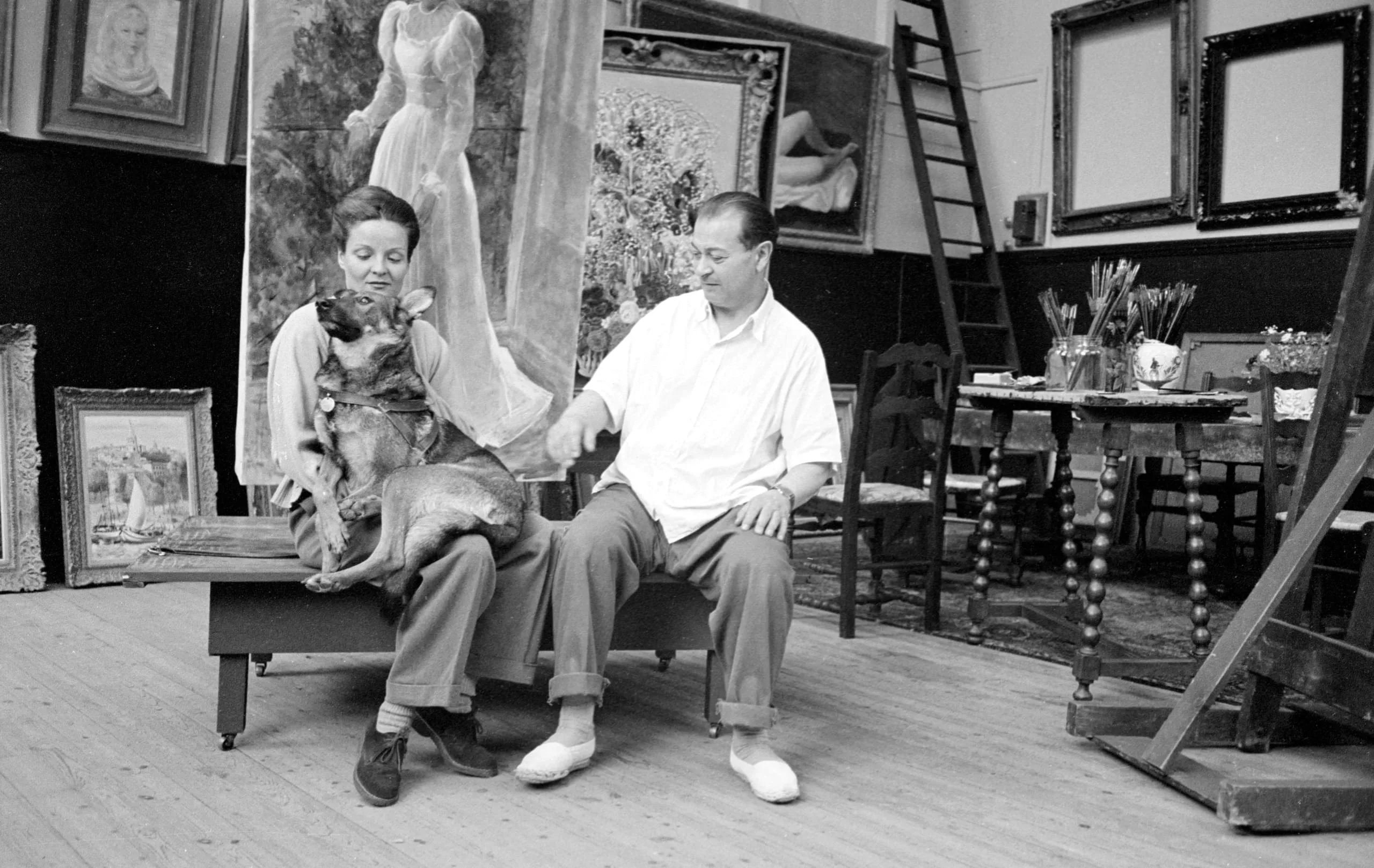 Black and white photograph of a woman and a heavyset man seated in a painter's studio, a large dog in the woman's lap, surrounded by canvases and art supplies