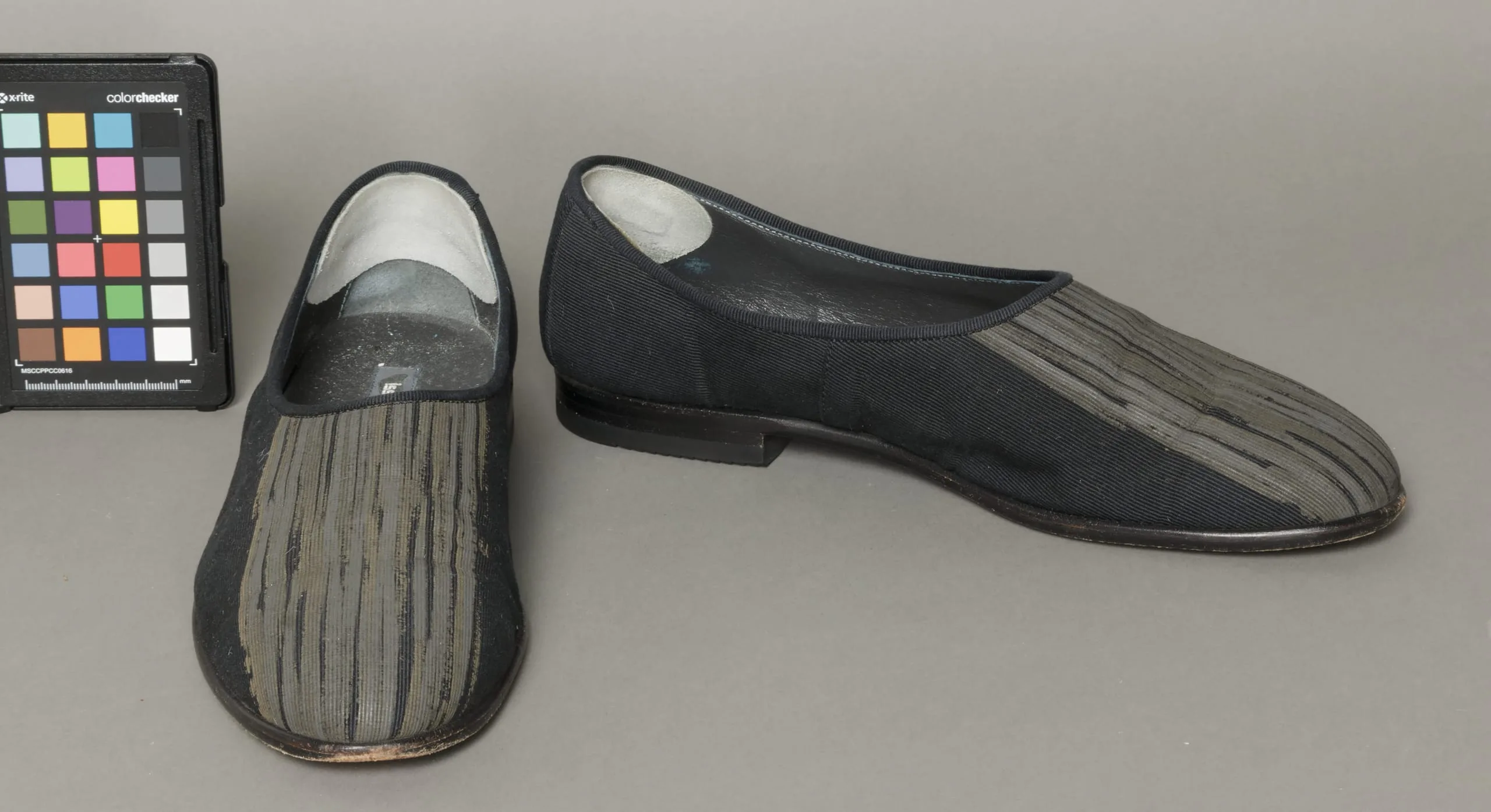 Pair of black slip-on shoes with striped gray and silver toe sections, displayed on a gray surface, showing top and side profile views