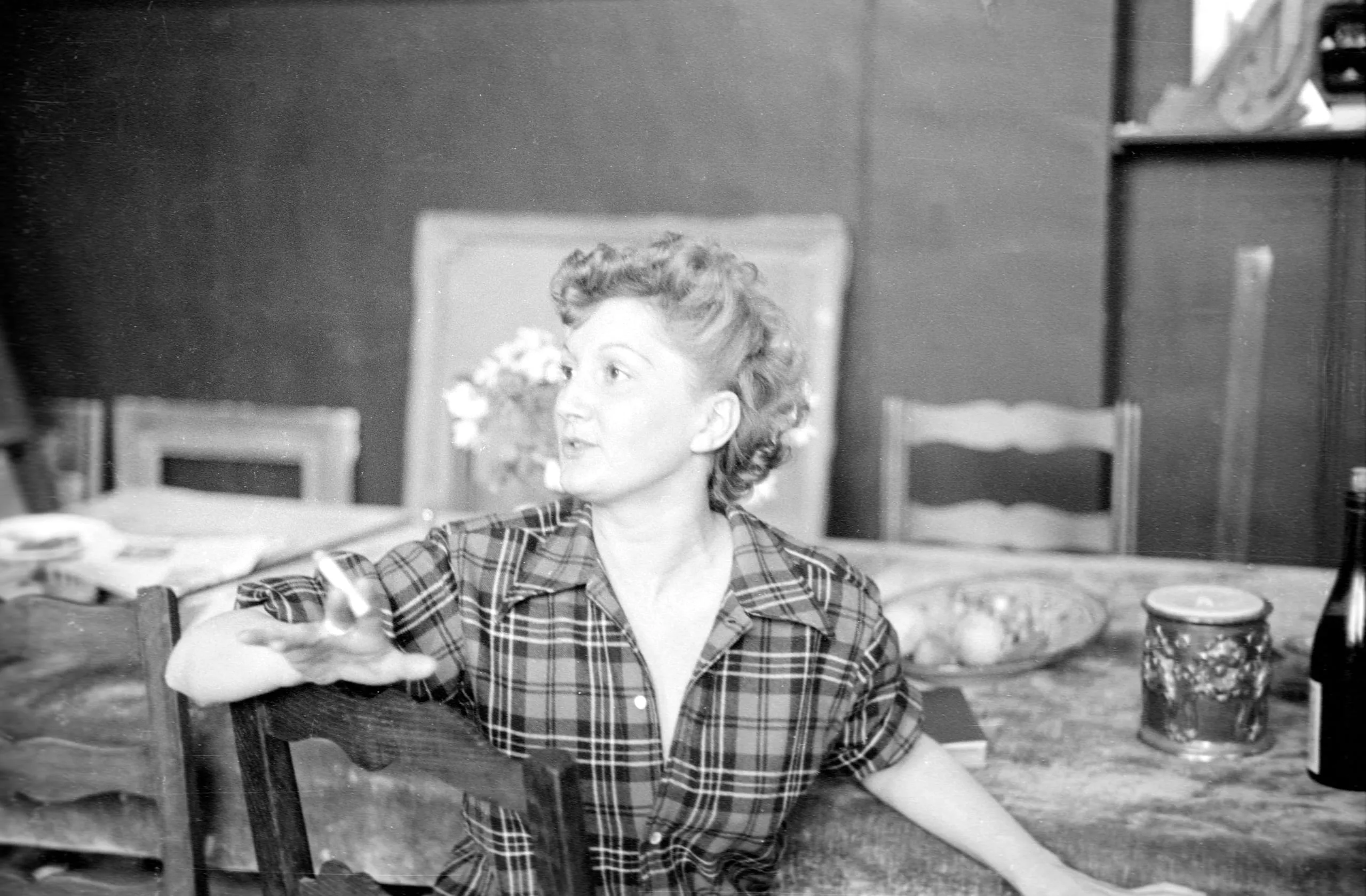 Black and white photograph, white woman with curled hair in plaid shirt seated at a table, turned to look off to the side