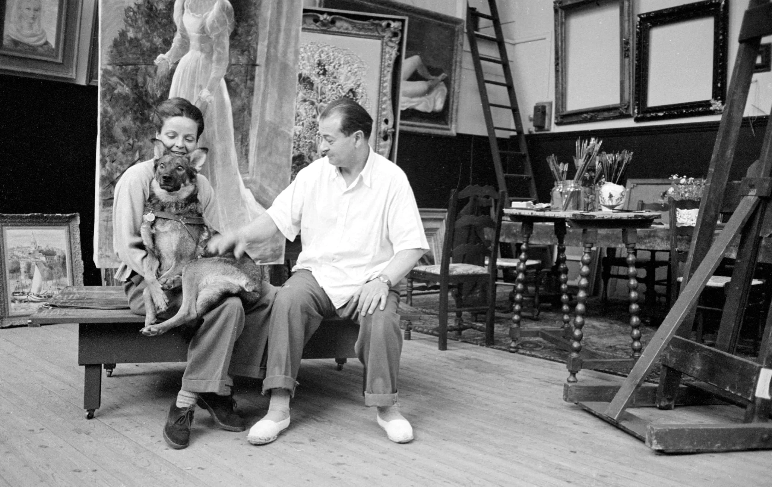 Black and white photograph of a man and woman seated with a dog in an artist's studio, surrounded by large canvases and painting supplies