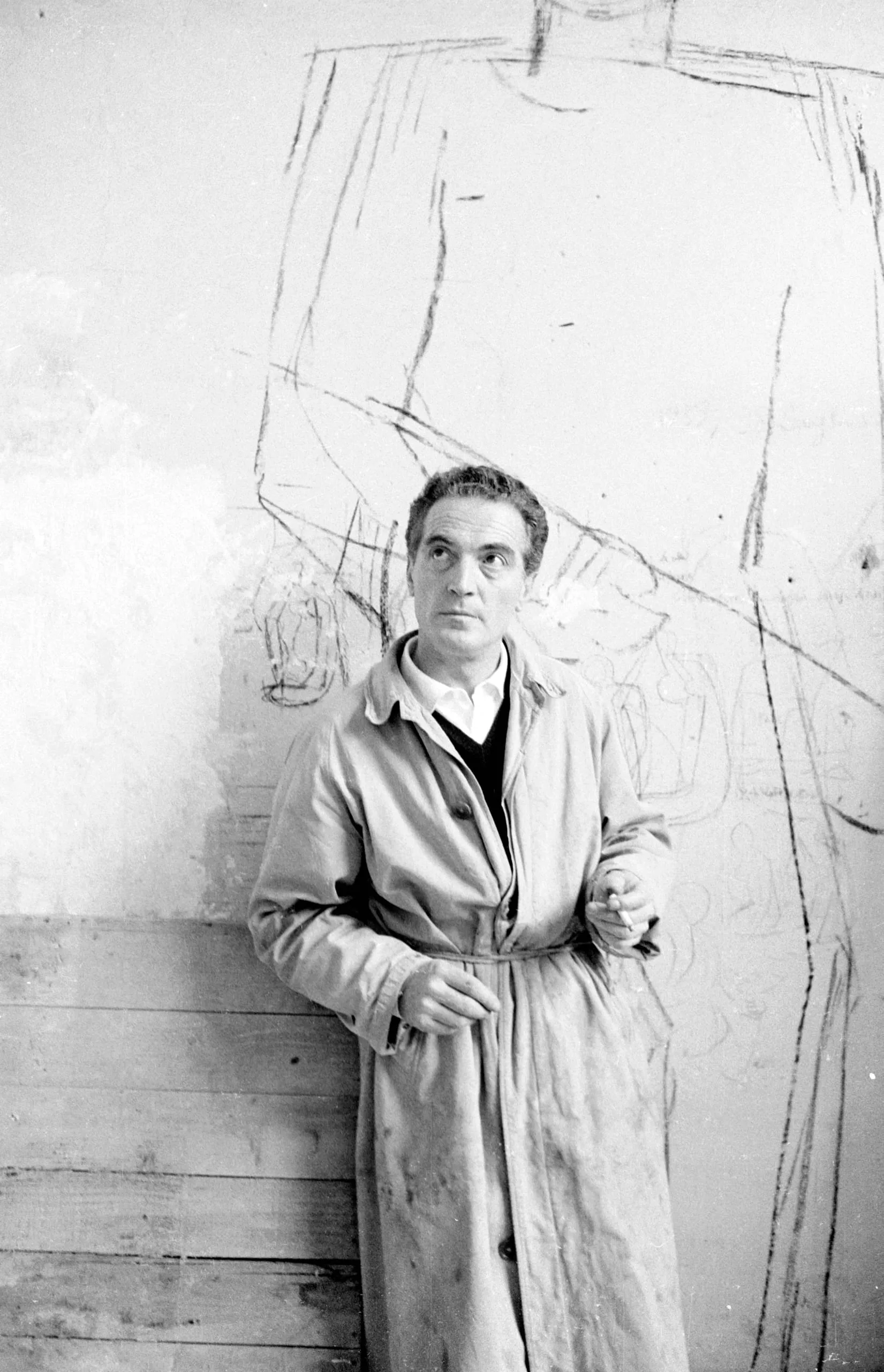 Black and white photograph of a man in a trench coat standing against a plaster wall covered with a large gestural charcoal figure drawing, looking upward to his left