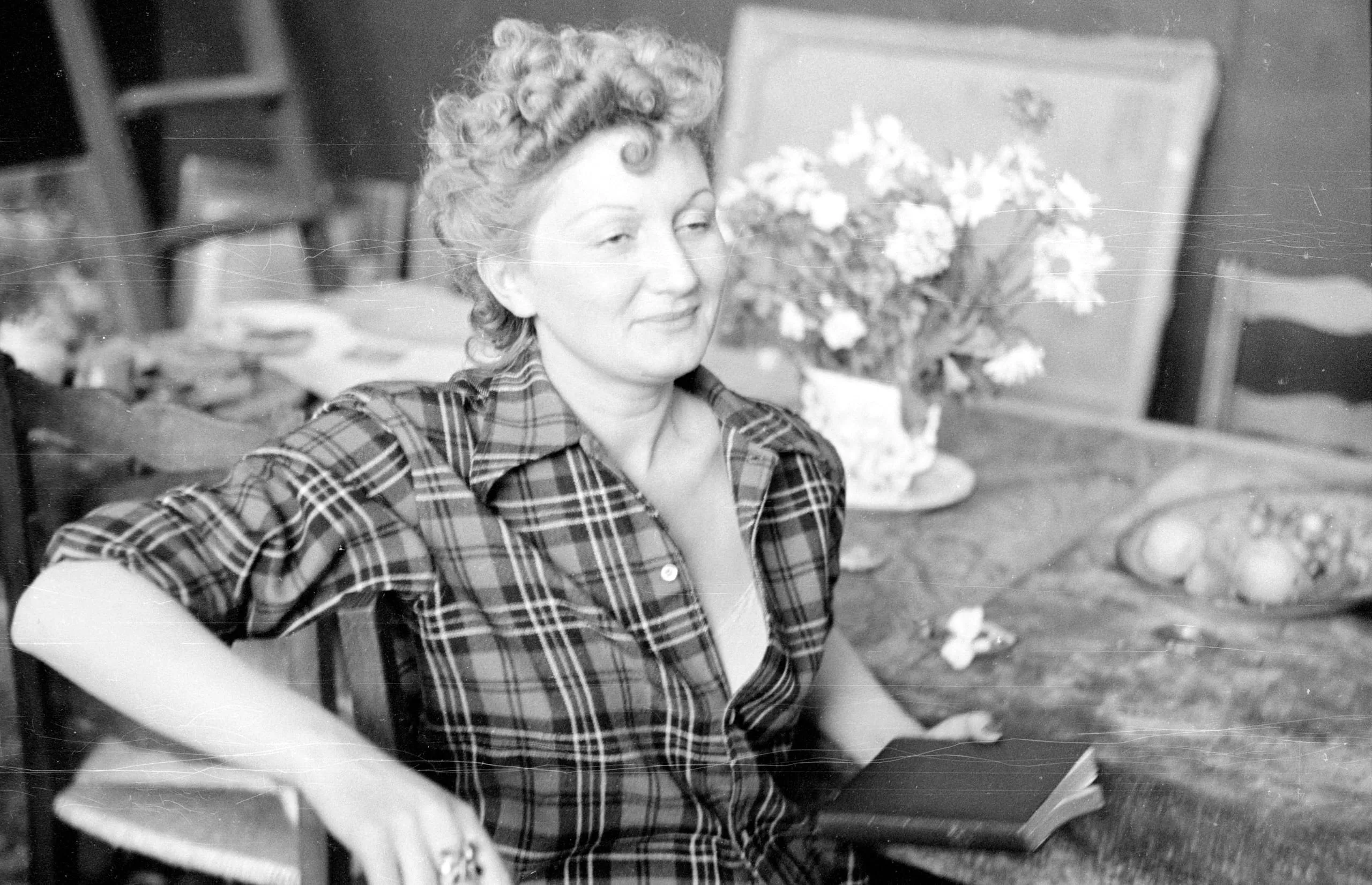 Black and white photograph, white woman with curly blonde hair seated at a table in a plaid shirt, looking to the left, with a flower vase and book nearby