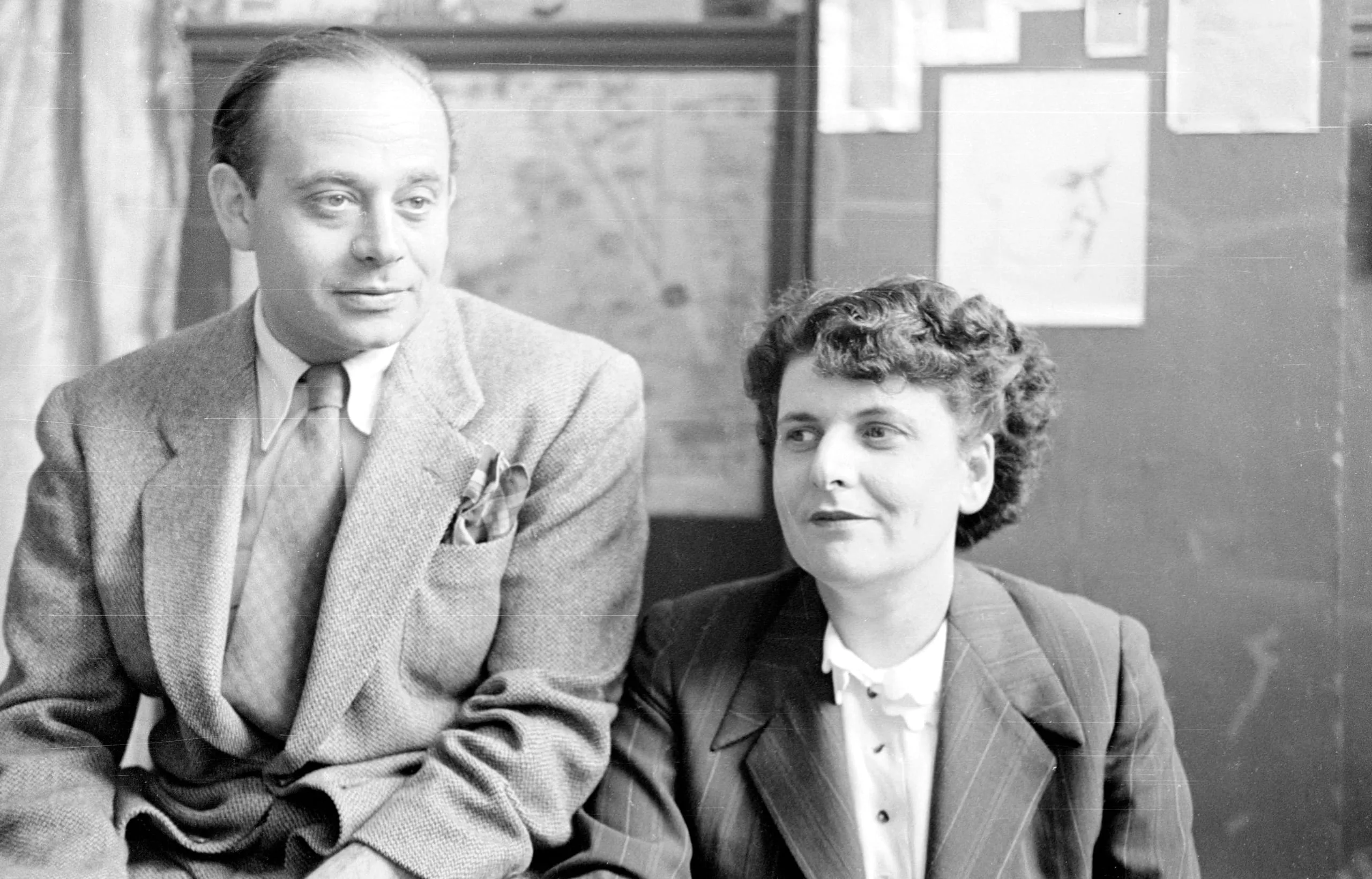 Black and white photograph of a bald man and a curly-haired woman seated side by side from the waist up, both in blazers, with papers pinned to a wall behind them