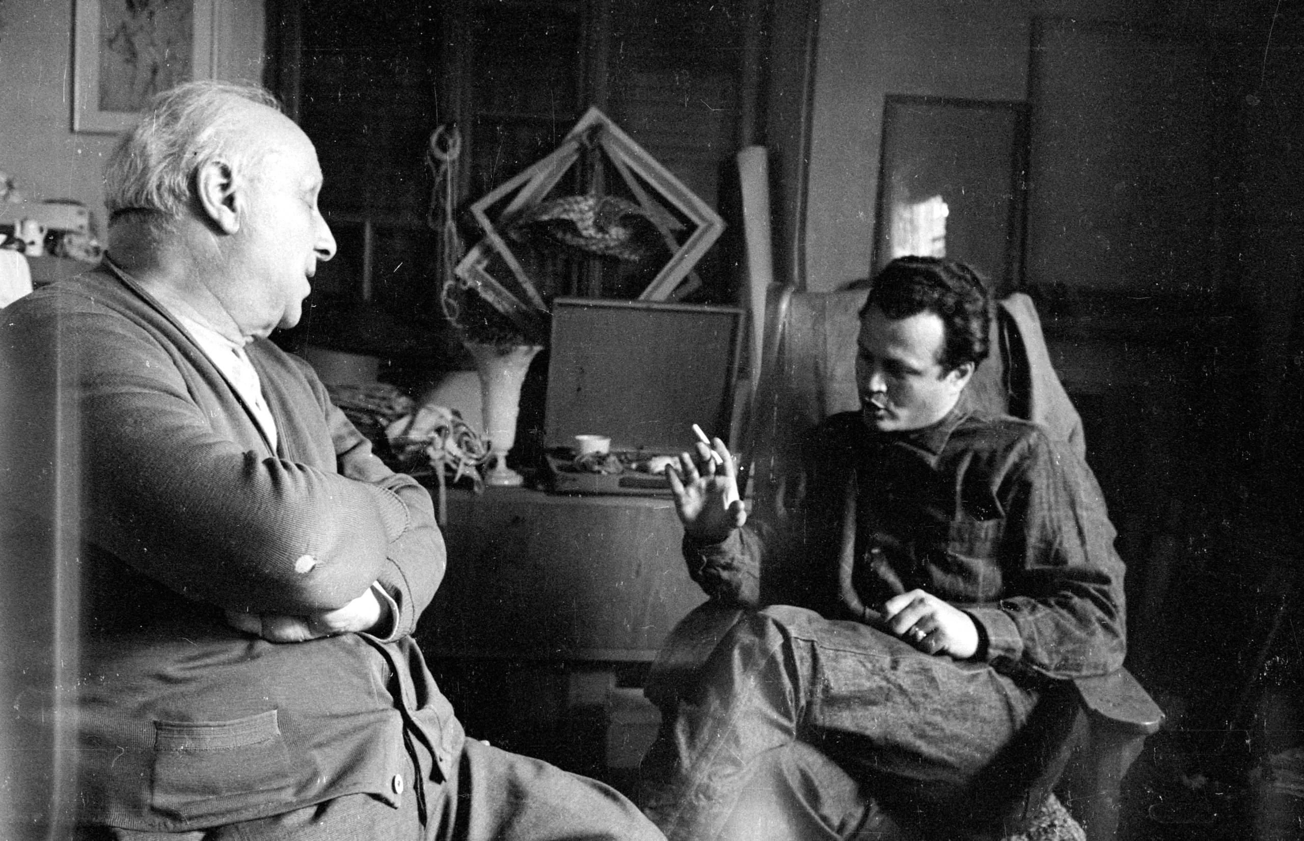 Black and white photograph of two men seated facing each other indoors, one heavyset with arms crossed, one younger and gesturing mid-conversation, cluttered studio behind them