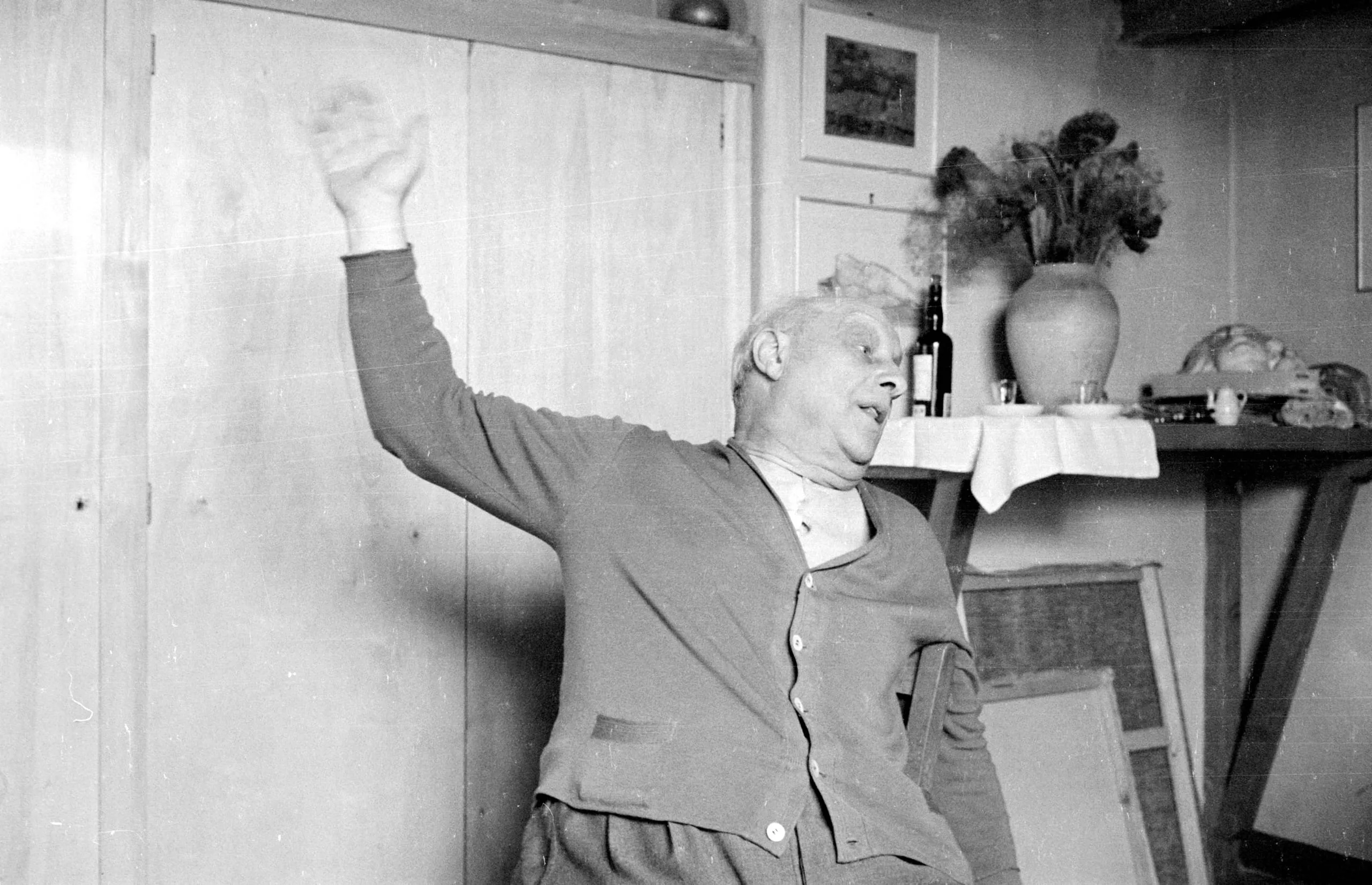 Black and white photograph of a heavyset, balding man with a cigarette, right arm raised high, mouth open, standing before a wooden panel wall indoors