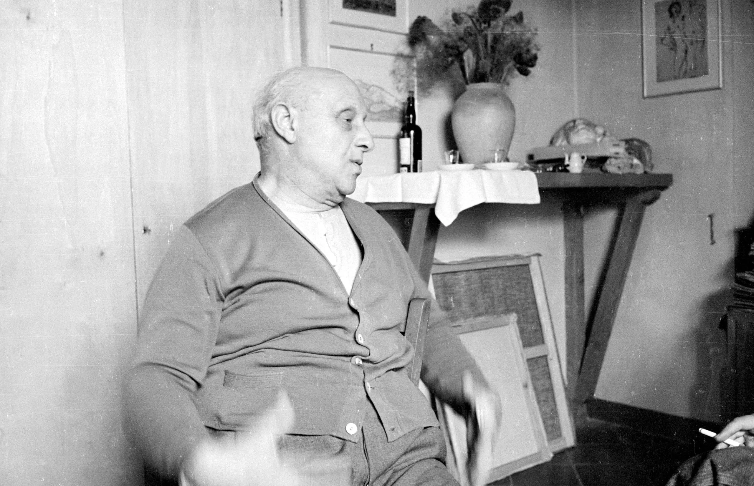 Black and white photograph of a heavyset man seated in profile, wearing a cardigan, with shelving, a bottle, and a vase of flowers behind him
