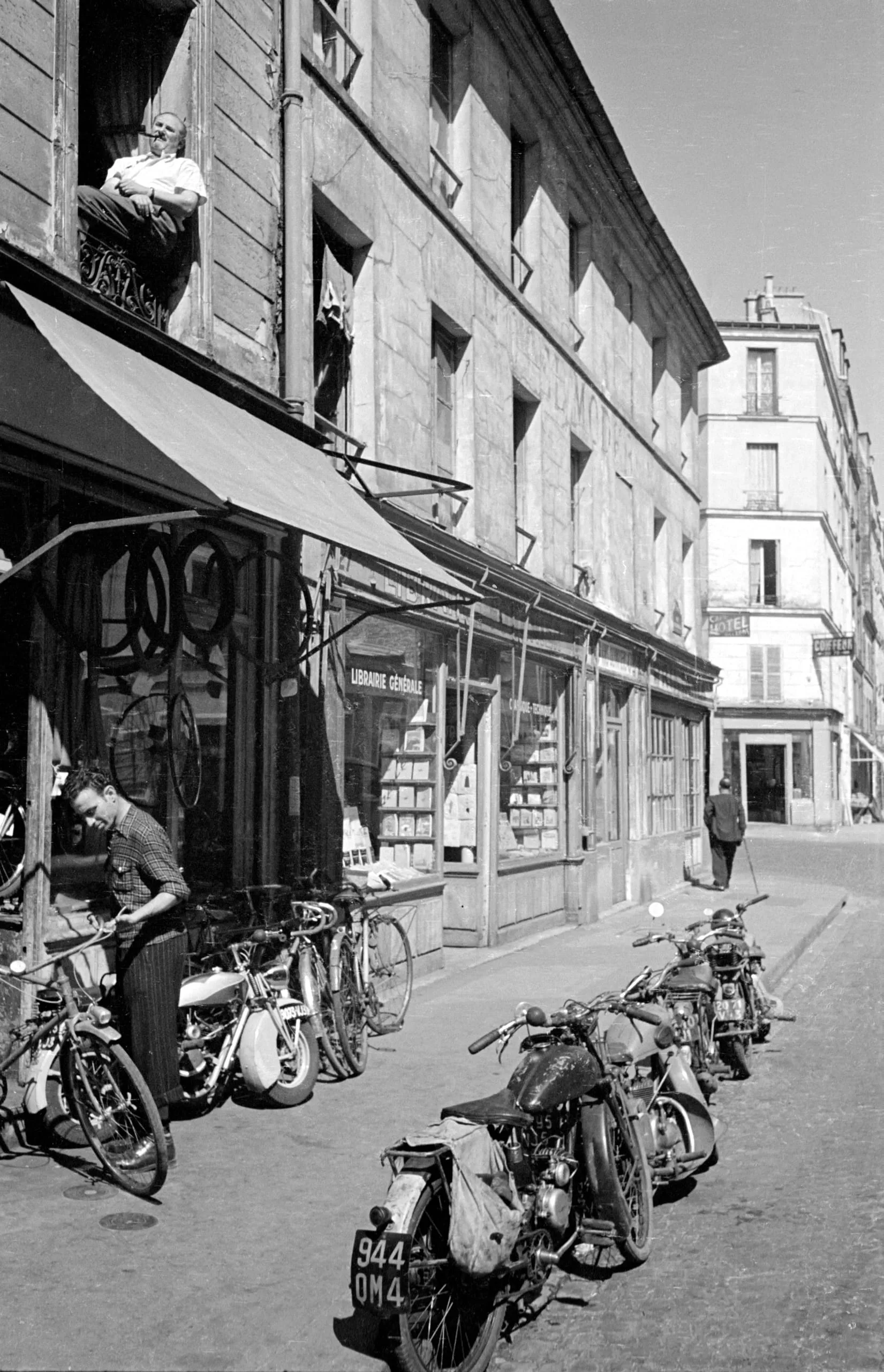 Black and white photograph of a Parisian street with parked motorcycles and bicycles in front of a bookshop, figures on the sidewalk, and a person leaning from an upper-floor window