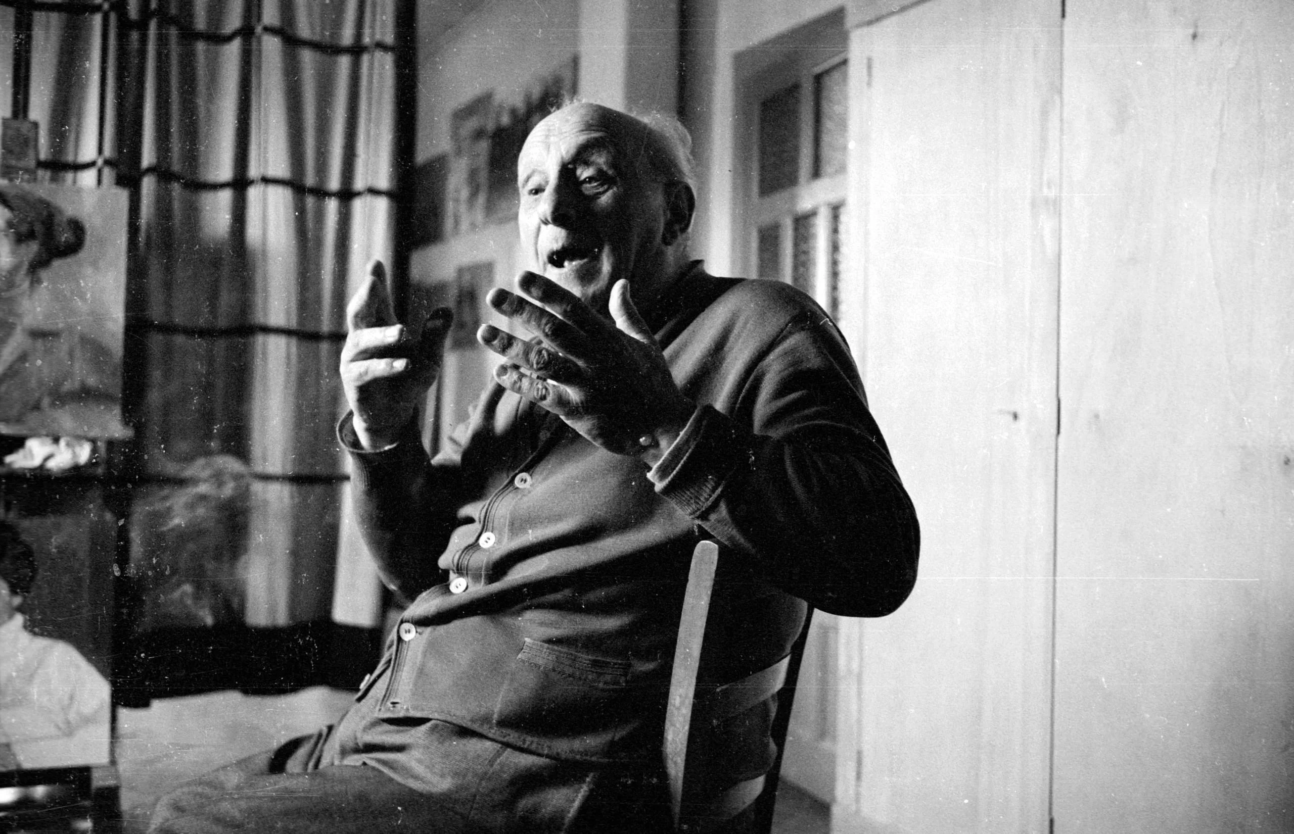 Black and white photograph of an older white man seated in a wooden chair, mouth open, both hands raised, wearing a dark cardigan
