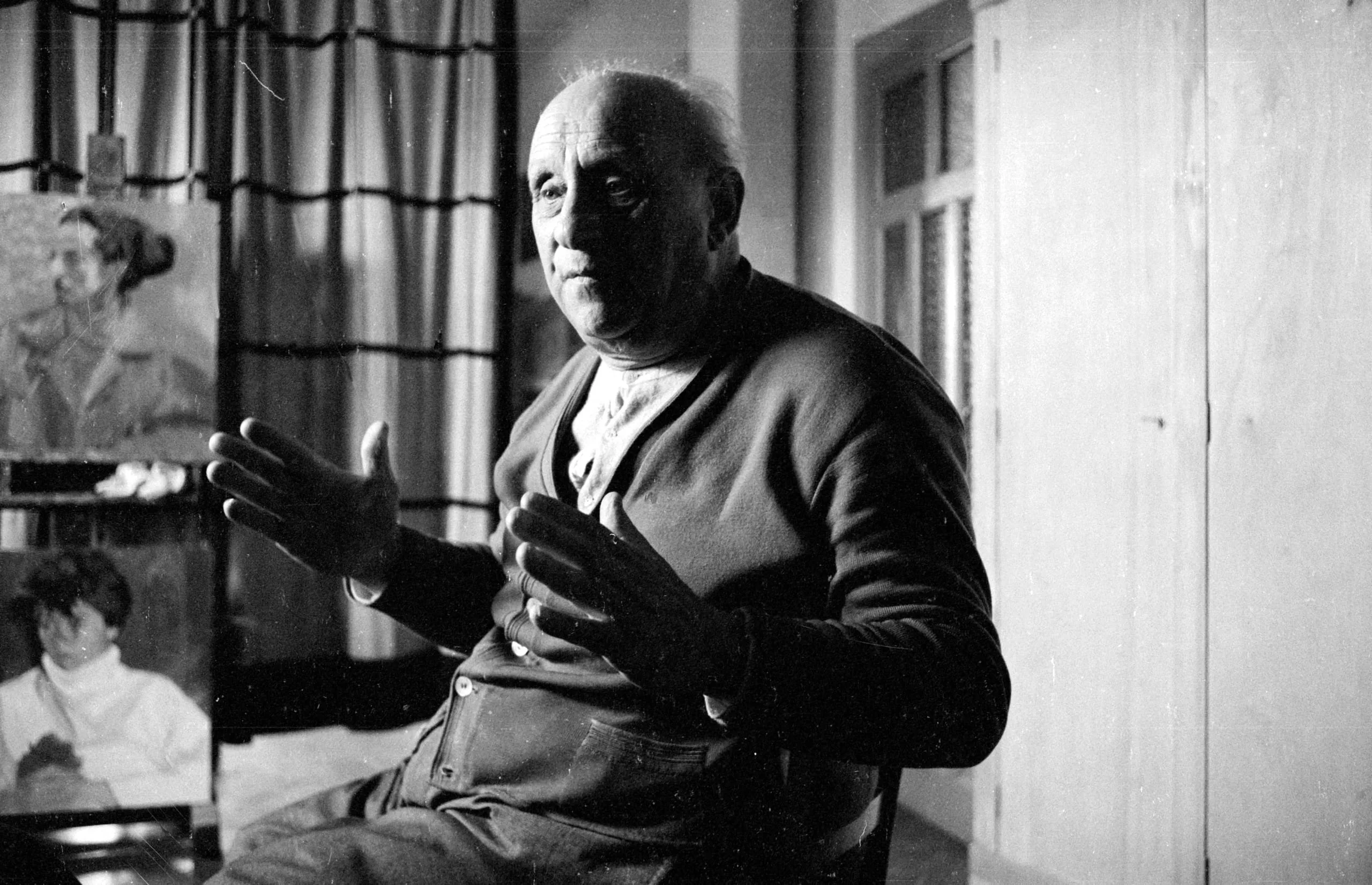 Black and white photograph of an older bald man seated with both hands raised in an open gesture, wearing a dark cardigan, with a window behind him to the right