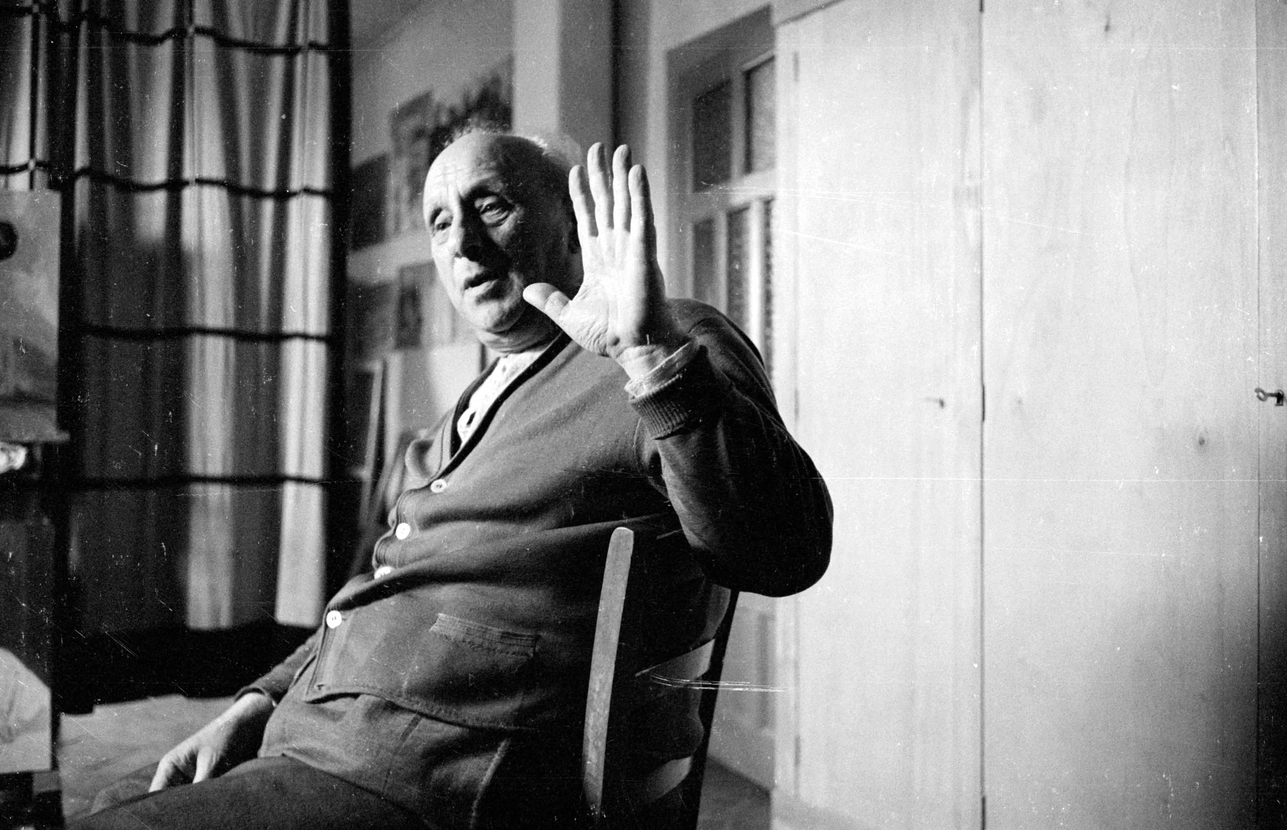 Black and white photograph of an older white man seated in a wooden chair, raising his right hand palm-out toward the camera, softly lit from the right