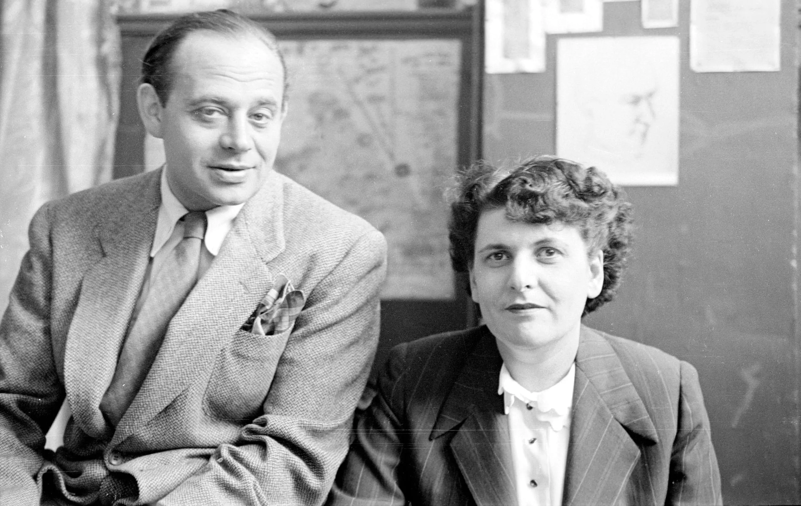Black and white photograph of a man and woman seated side by side from the waist up, both facing the camera, with papers and a framed map on the wall behind them