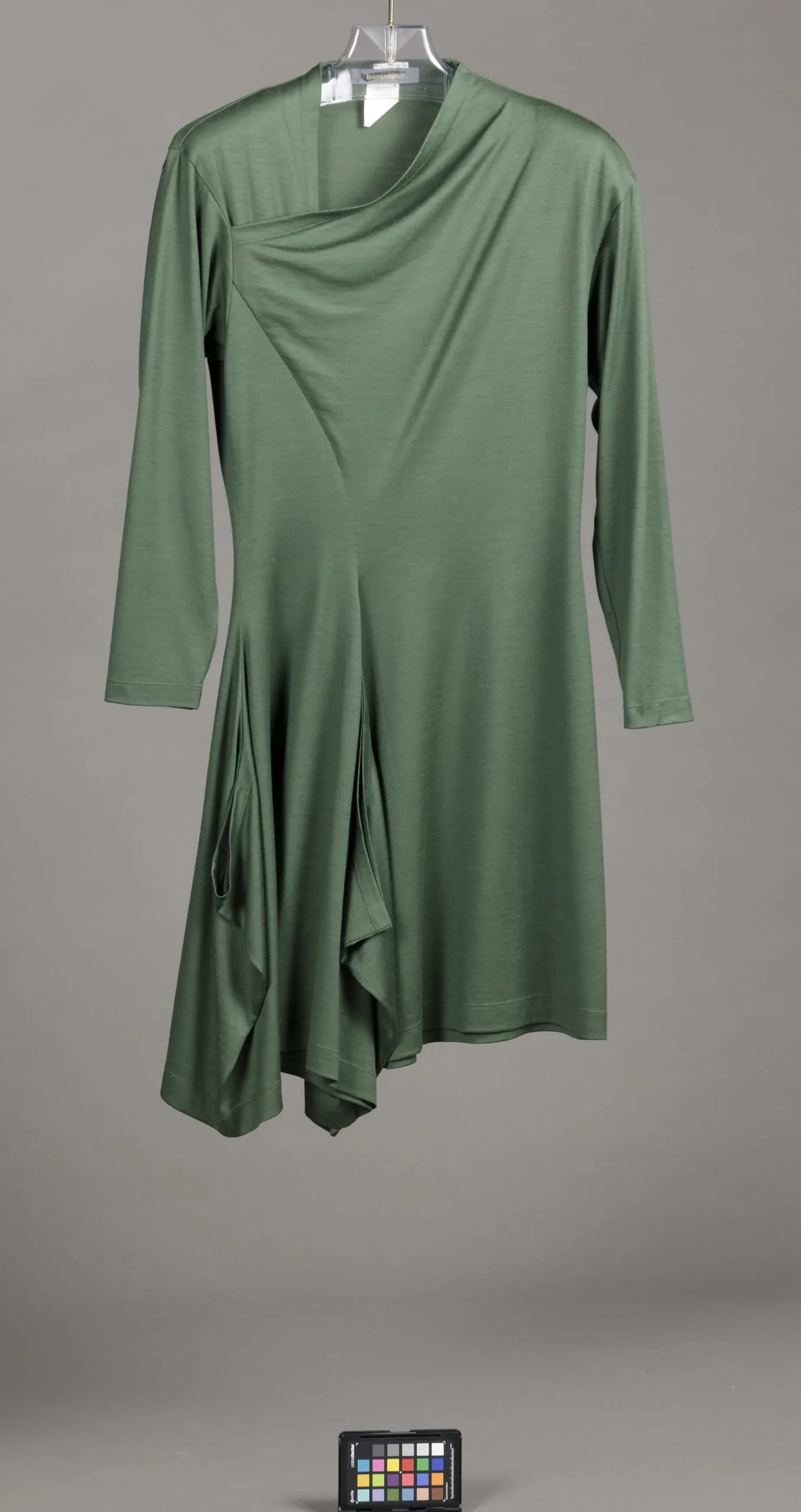 Sage green knit short dress on a hanger, with draped cowl neckline, long sleeves, and asymmetrical cascading hemline