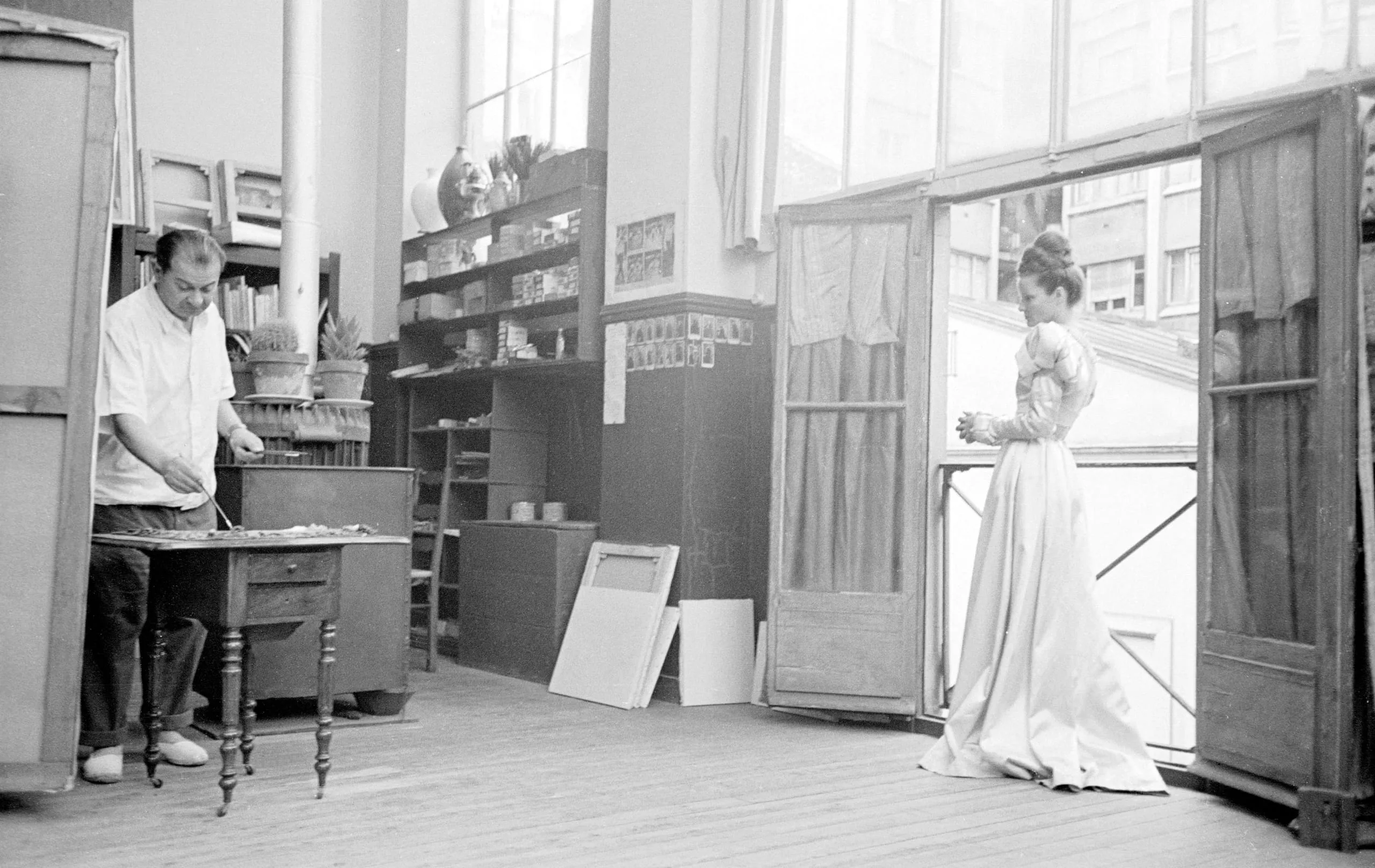 Black and white photograph of an artist's studio interior, a man working at a table on the left and a woman in a long pale gown standing by open doors on the right