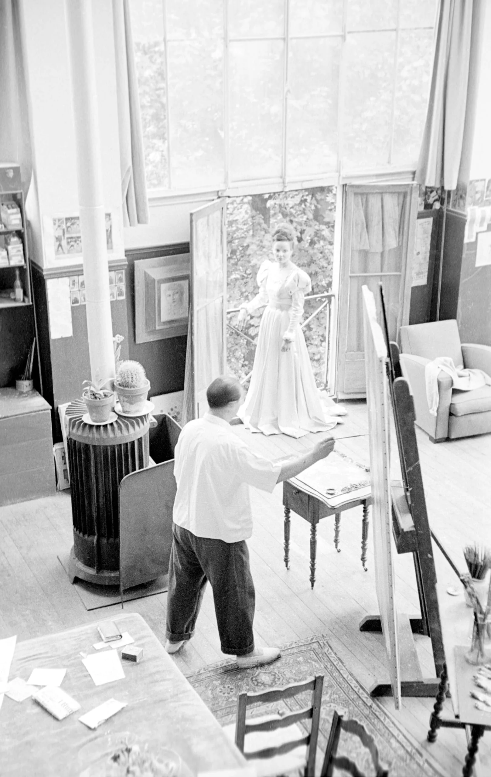 Black and white photograph shot from above, showing an artist with his back turned sketching at a table while a woman in a full-length white dress poses near a tall studio window