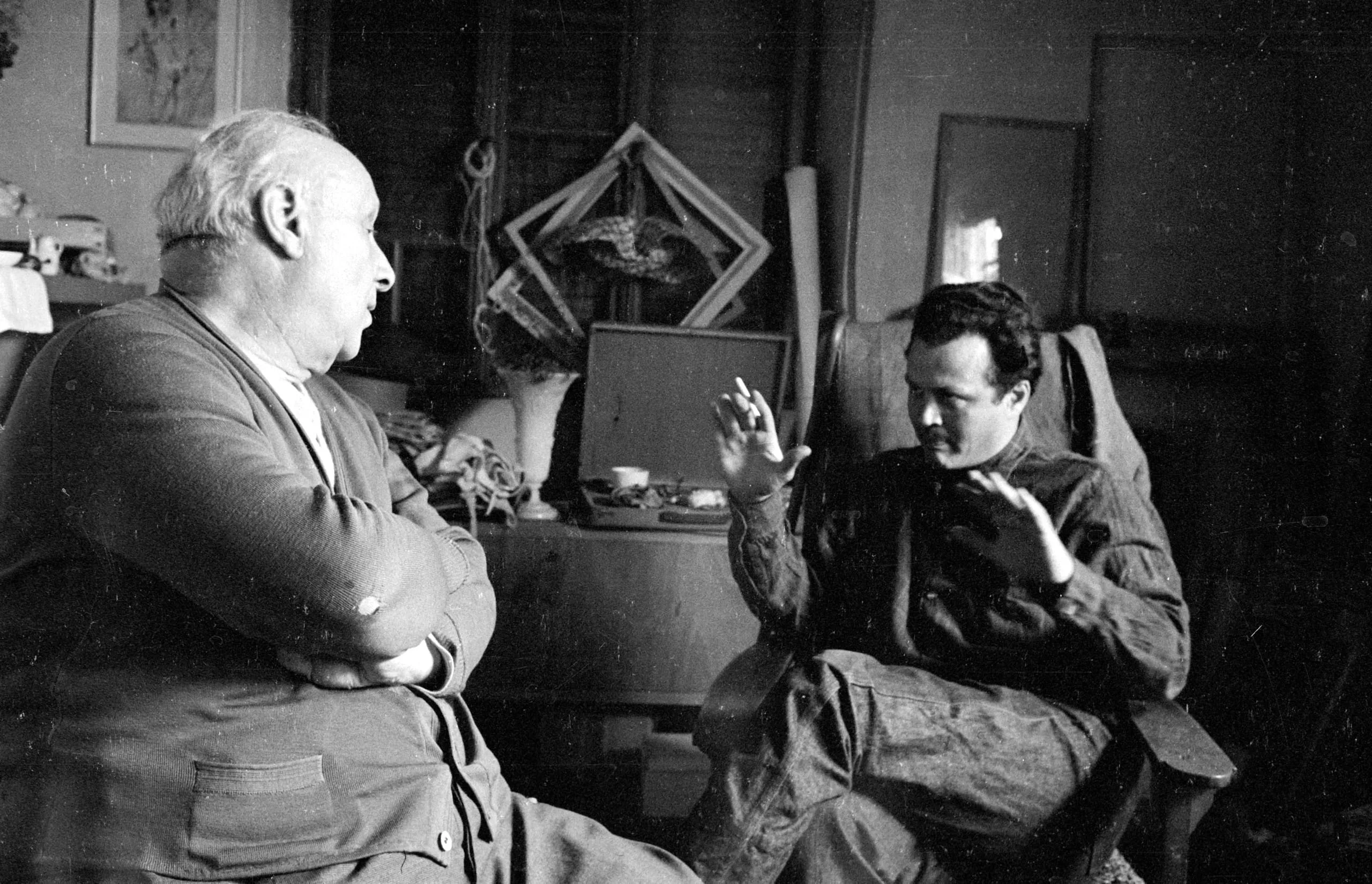 Black and white photograph of two men seated indoors in conversation, one heavyset and bald with arms crossed, the other lean and dark-haired with hands raised mid-gesture