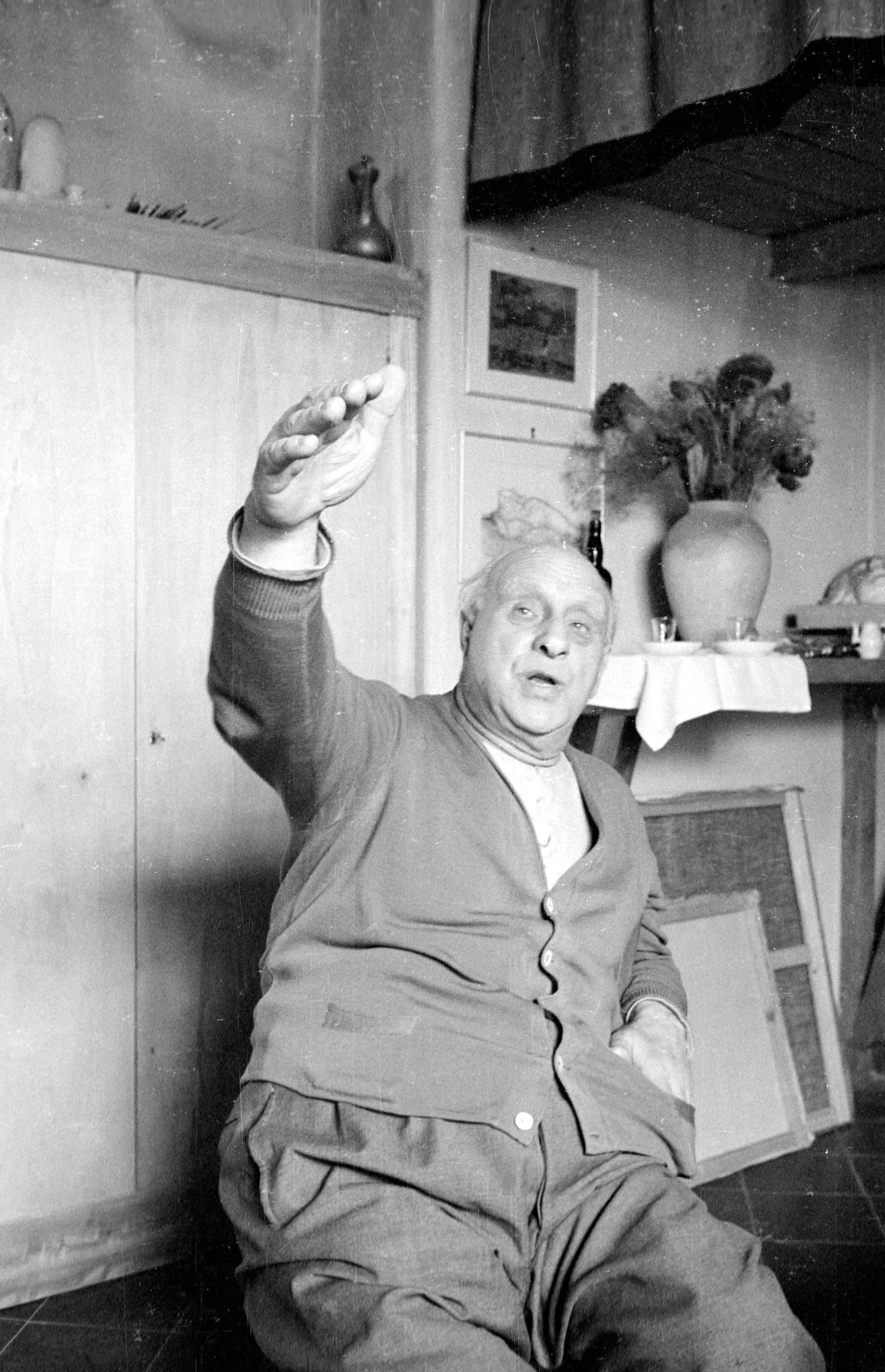 Black and white photograph of a heavyset man seated indoors, one arm raised with open palm toward the camera, mouth open, wearing a cardigan over a collared shirt