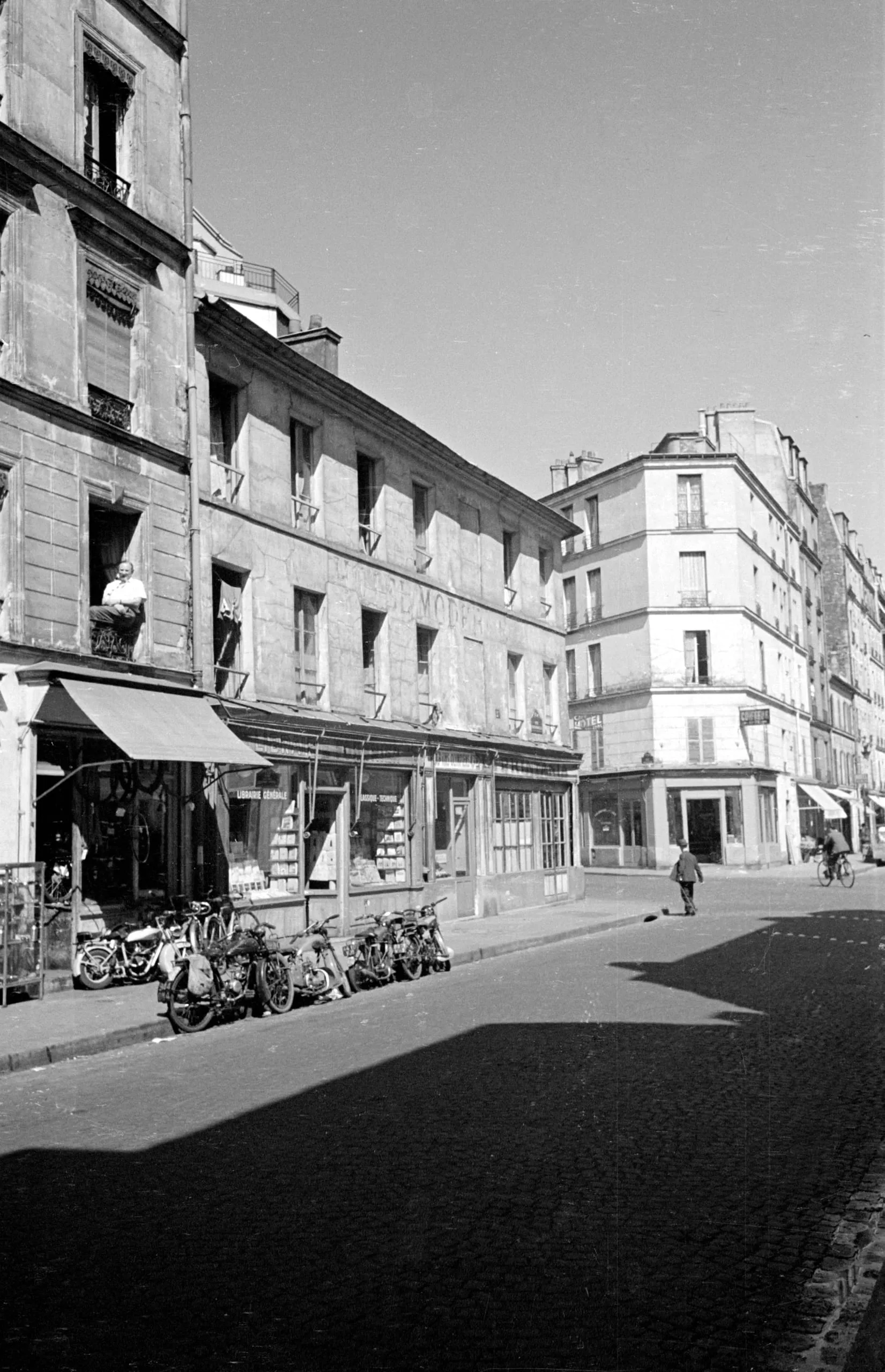Black and white photograph of a Parisian street with cobblestones, multi-story stone buildings, parked bicycles, and two distant pedestrians under bright directional sunlight