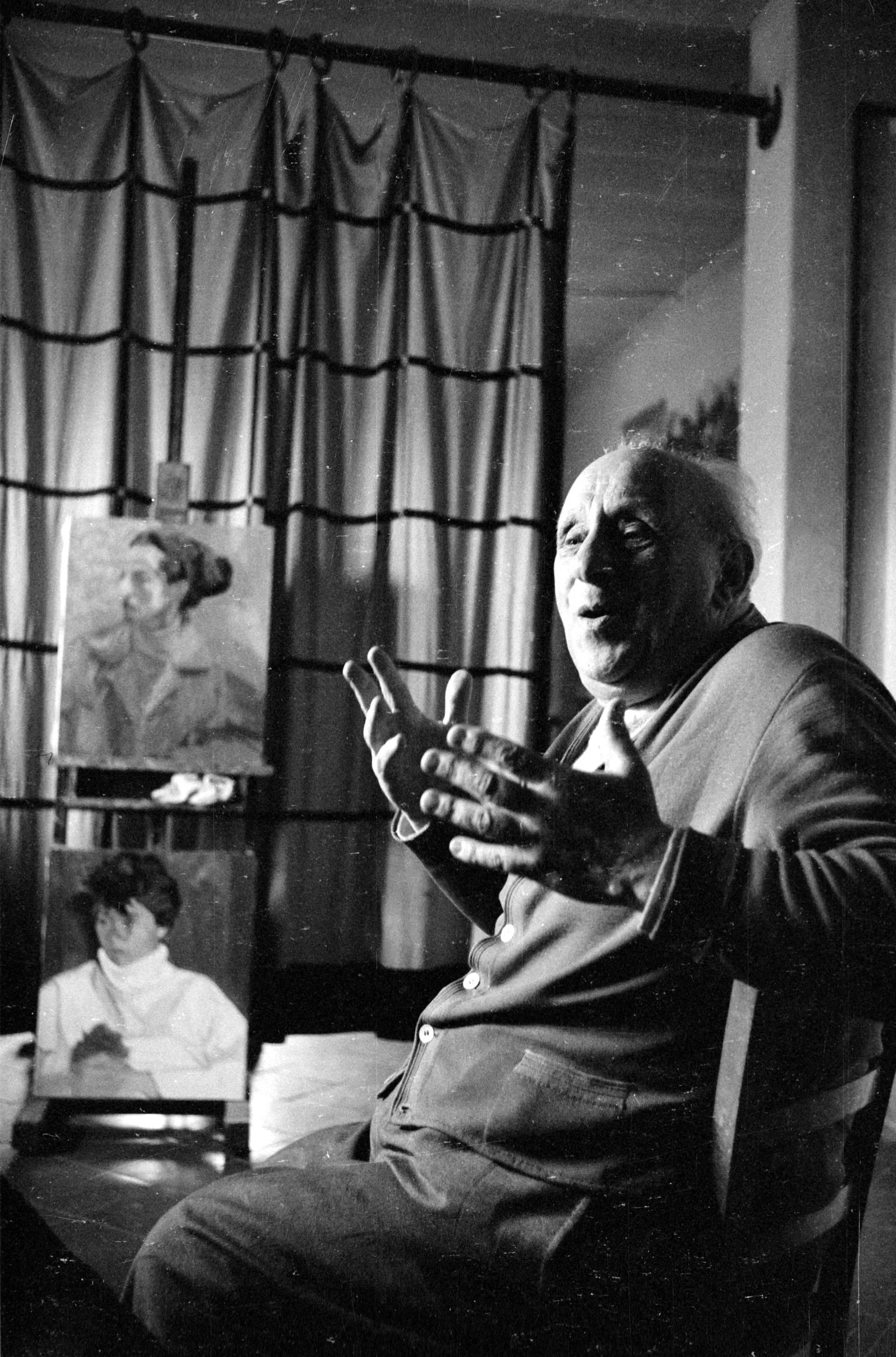 Black and white photograph of an elderly white man seated and gesturing with both hands open, two portrait paintings visible behind him