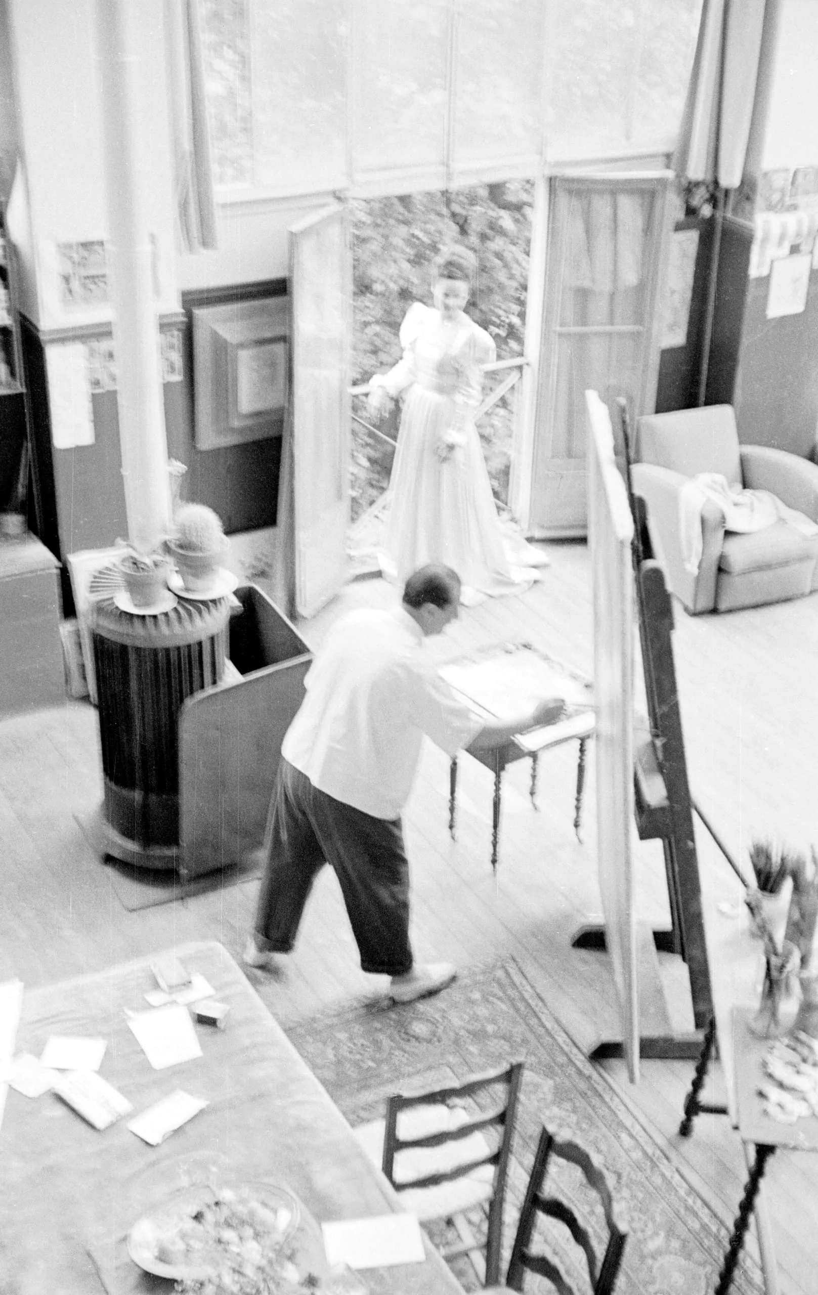 Black and white photograph taken from above, showing a man in a light shirt leaning over a small table in an artist's studio, with a woman in a long white gown visible in an open doorway behind him