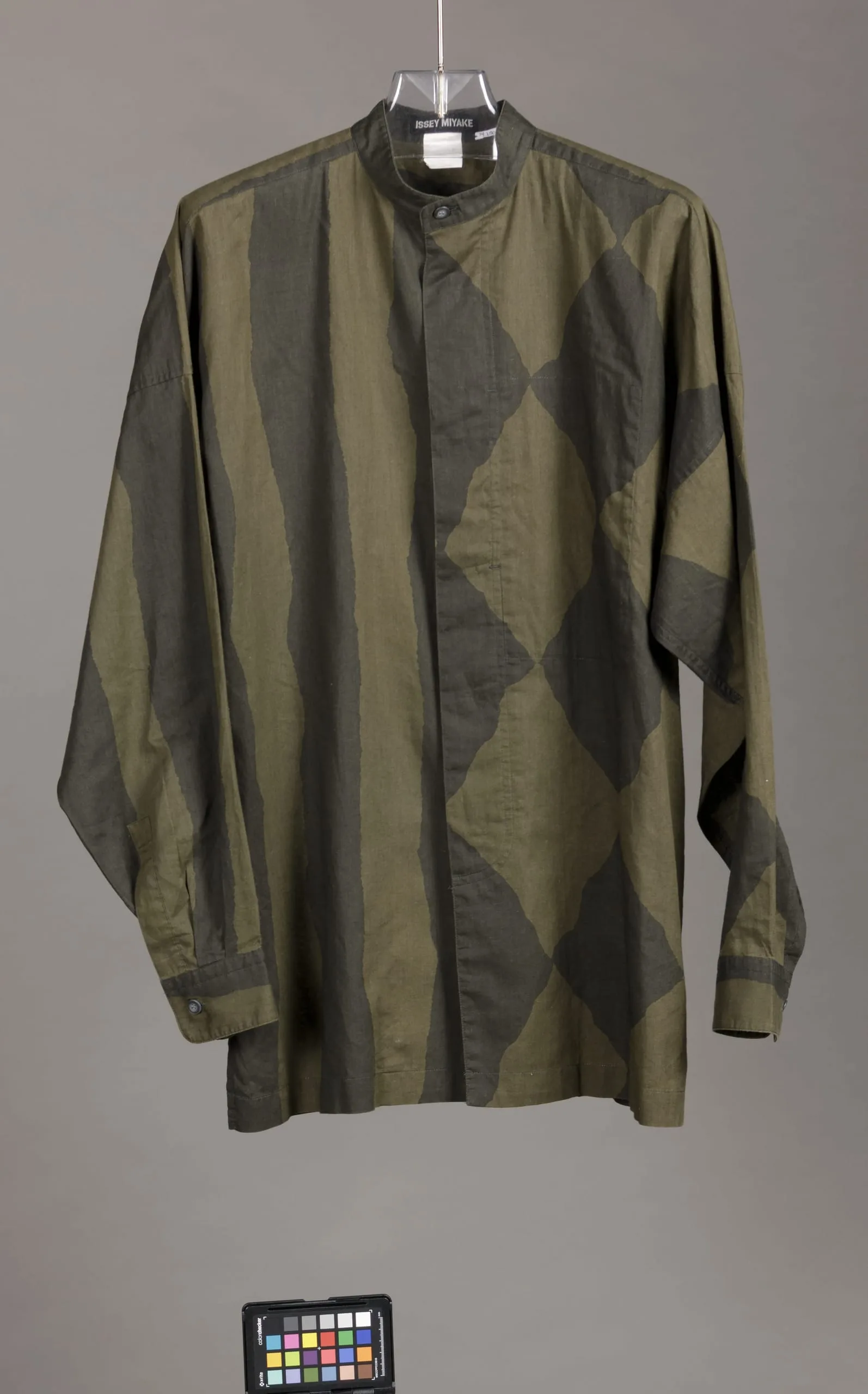 Pullover shirt in lightweight fabric with a large-scale harlequin diamond pattern in two shades of olive green, displayed on a clear hanger