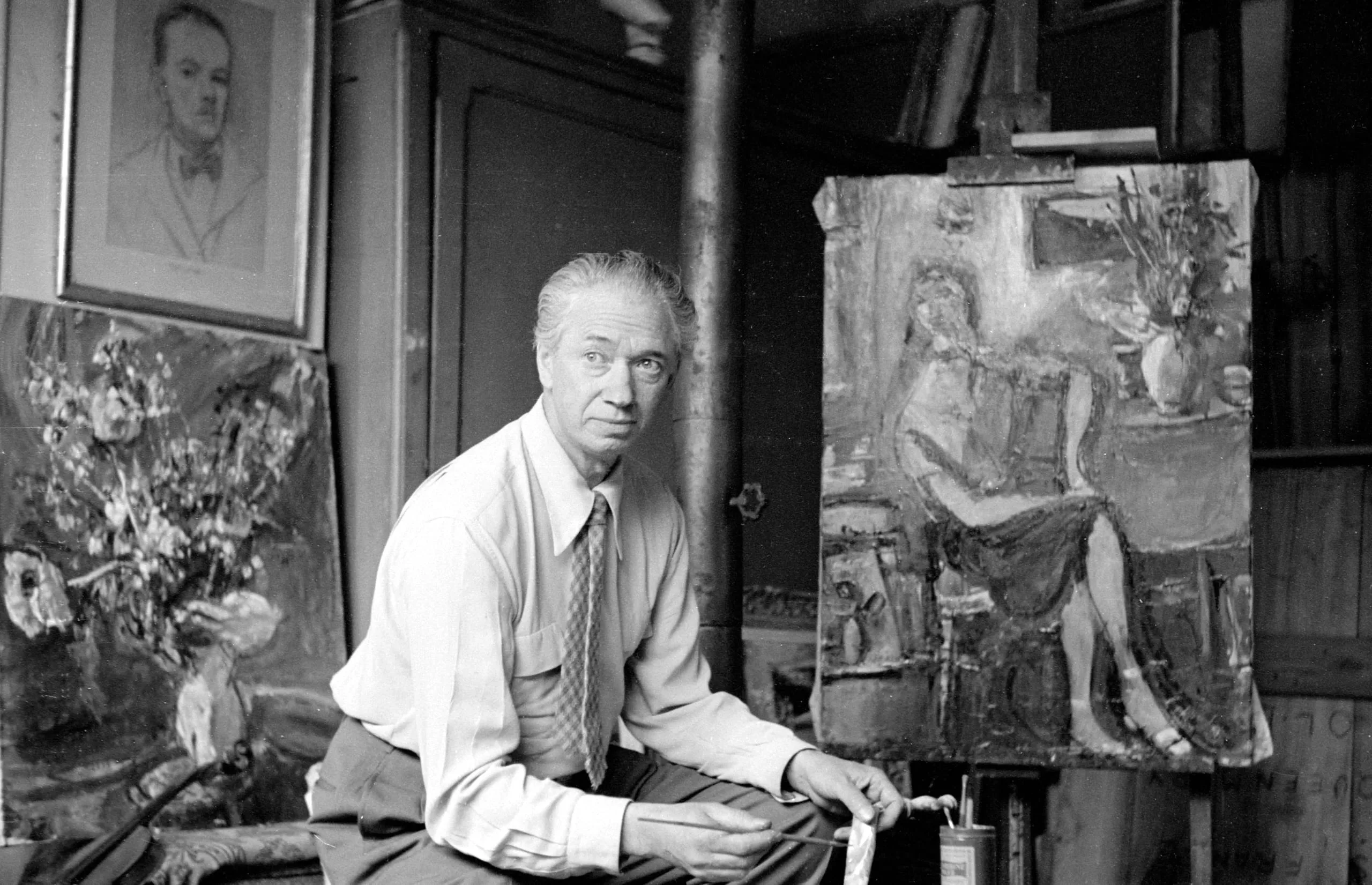 Black and white photograph of a man seated in an artist's studio, surrounded by paintings on easel and wall, looking directly at camera
