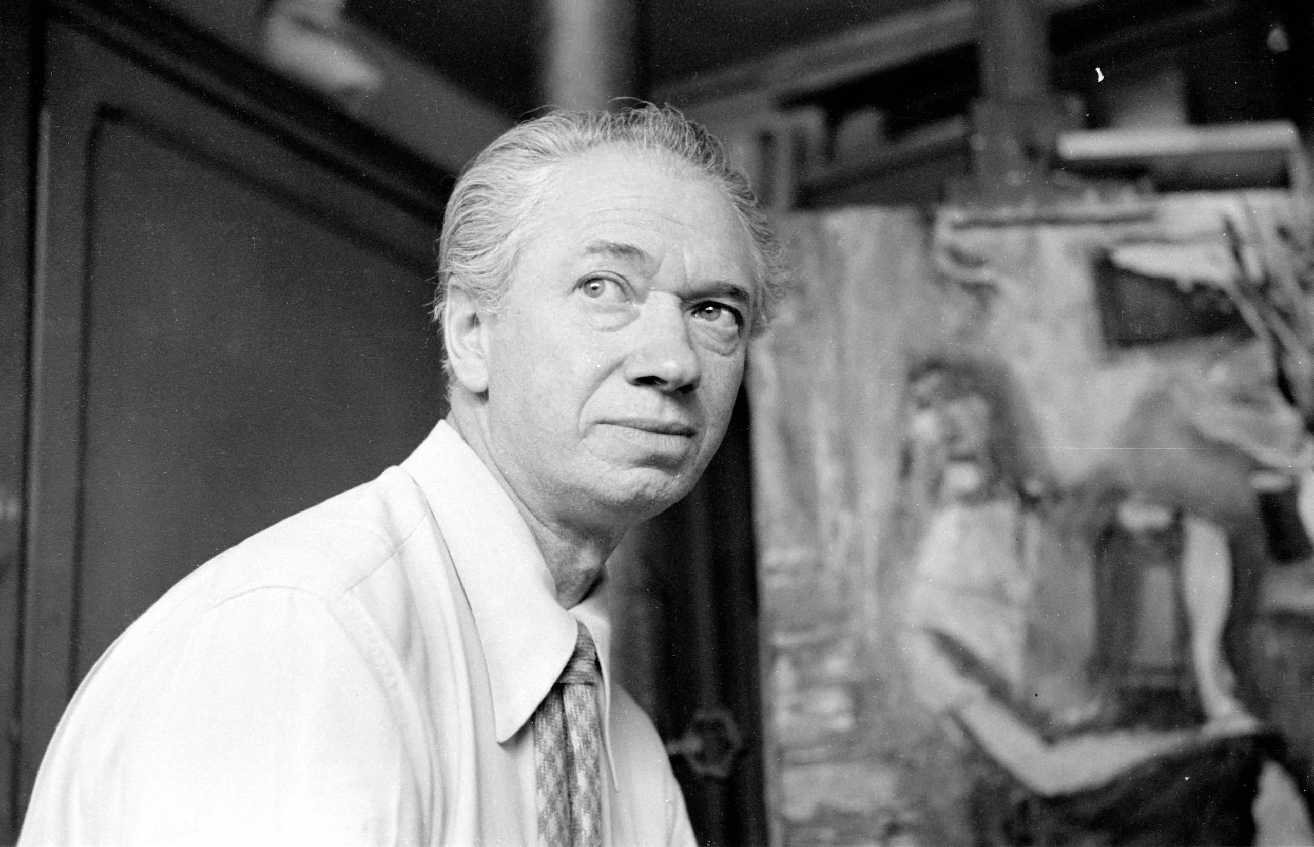 Black and white photograph, chest-up portrait of a white man with gray hair swept back, wearing a dress shirt and patterned tie, looking up and to the left, with a painting on an easel visible behind him