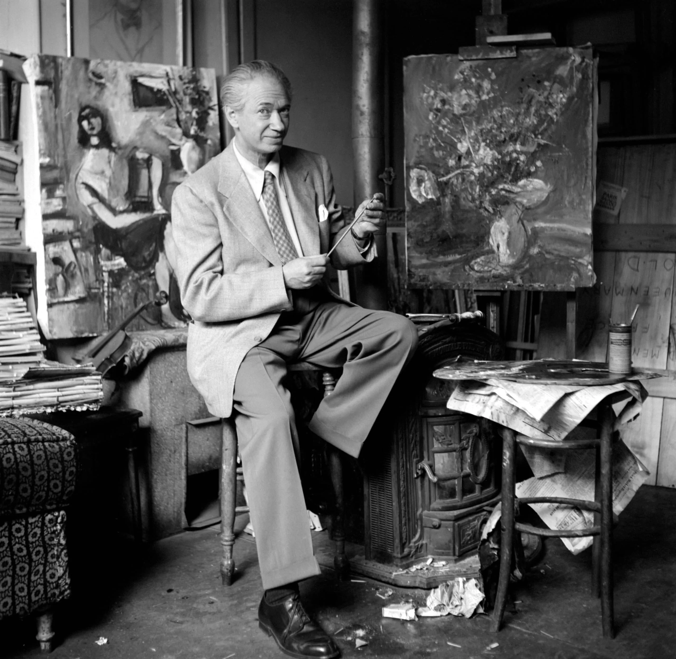 Black and white photograph of a white man in a blazer and tie seated in a cluttered artist's studio, holding a paintbrush, surrounded by canvases and an iron stove