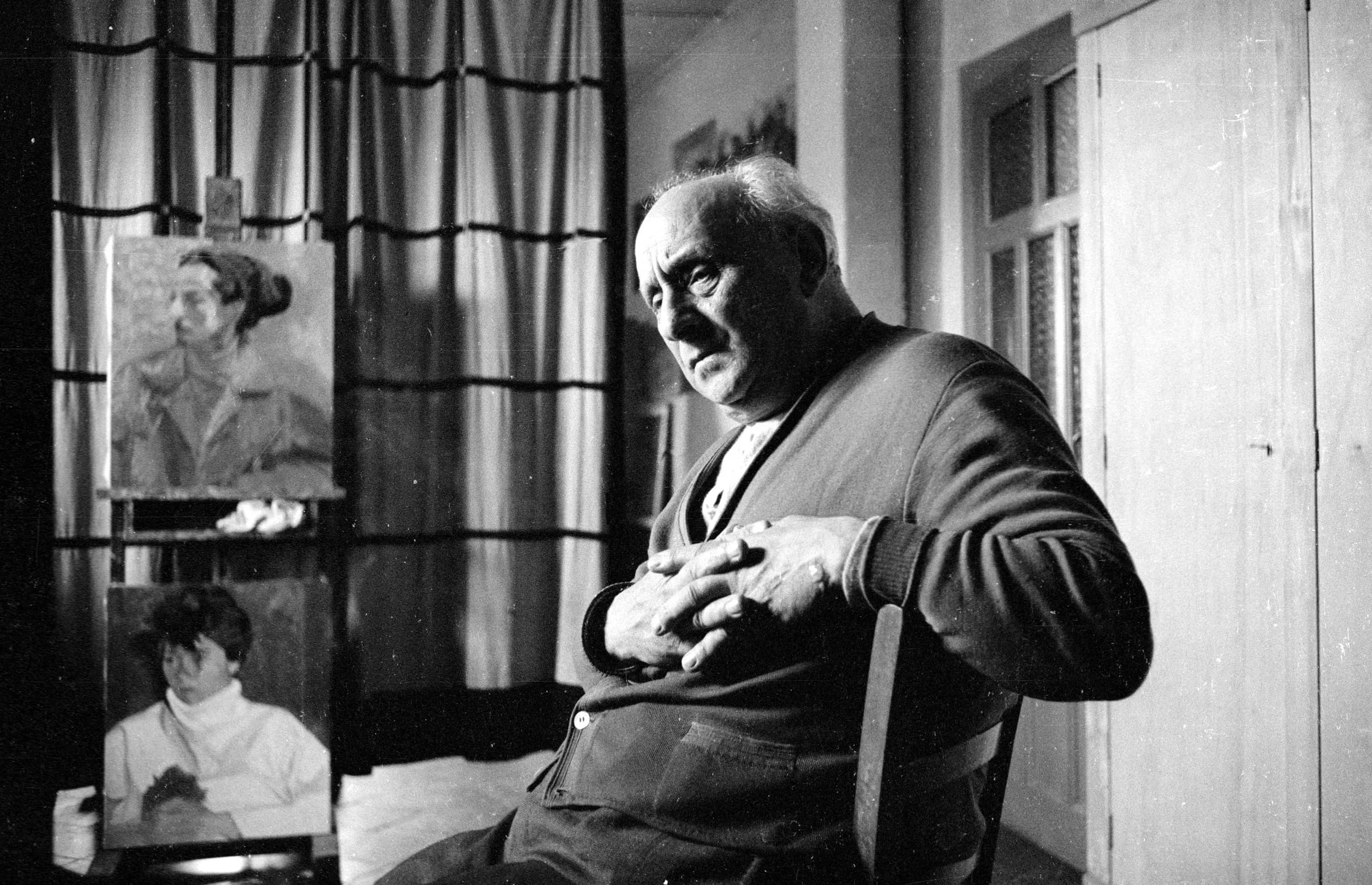 Black and white photograph of a heavyset, white man seated in a wooden chair, hands clasped at his chest, with two paintings visible on an easel behind him