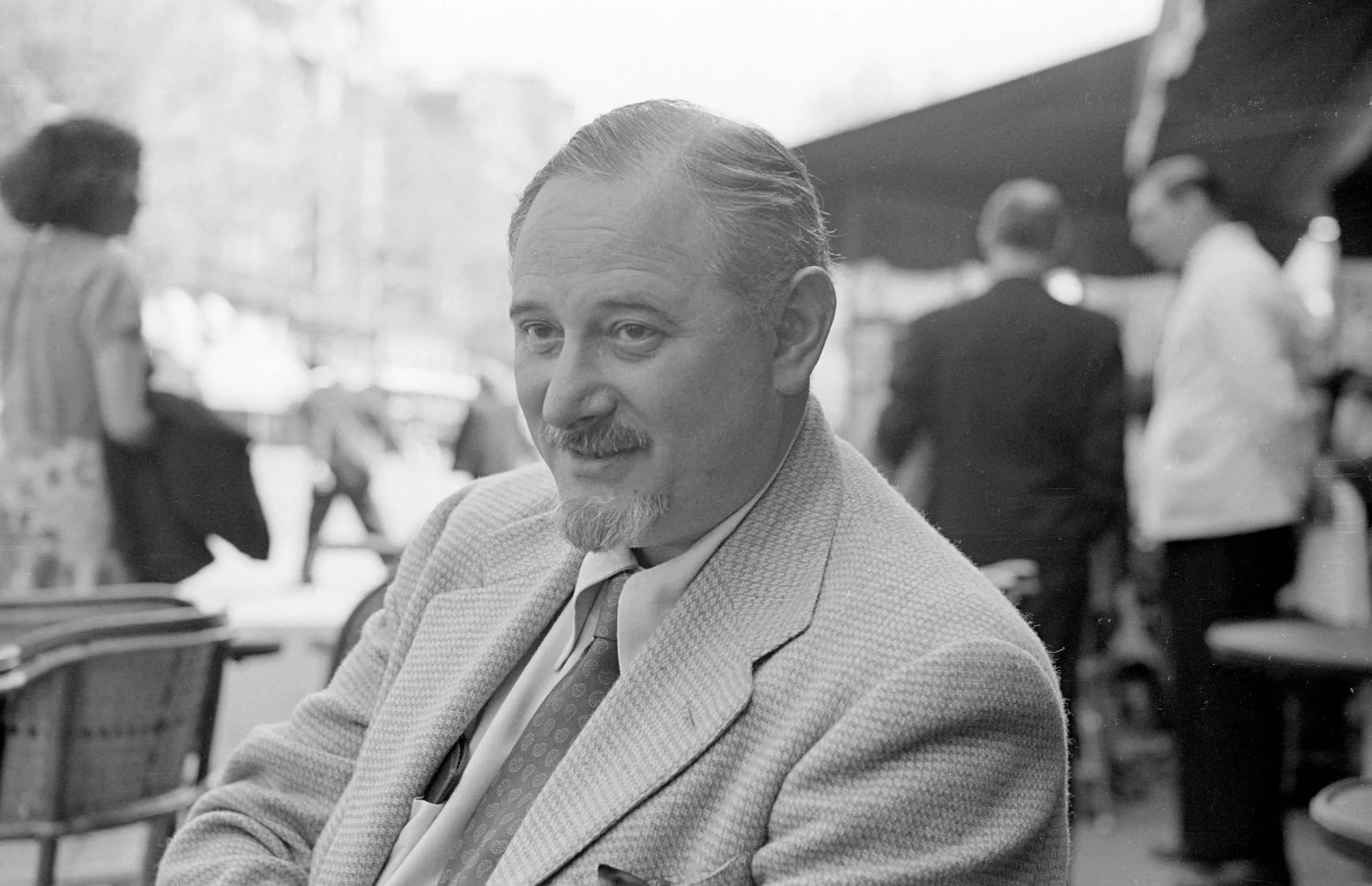 Black and white photograph, white man with mustache and goatee seated outdoors in a tweed jacket, arms crossed, looking toward the camera