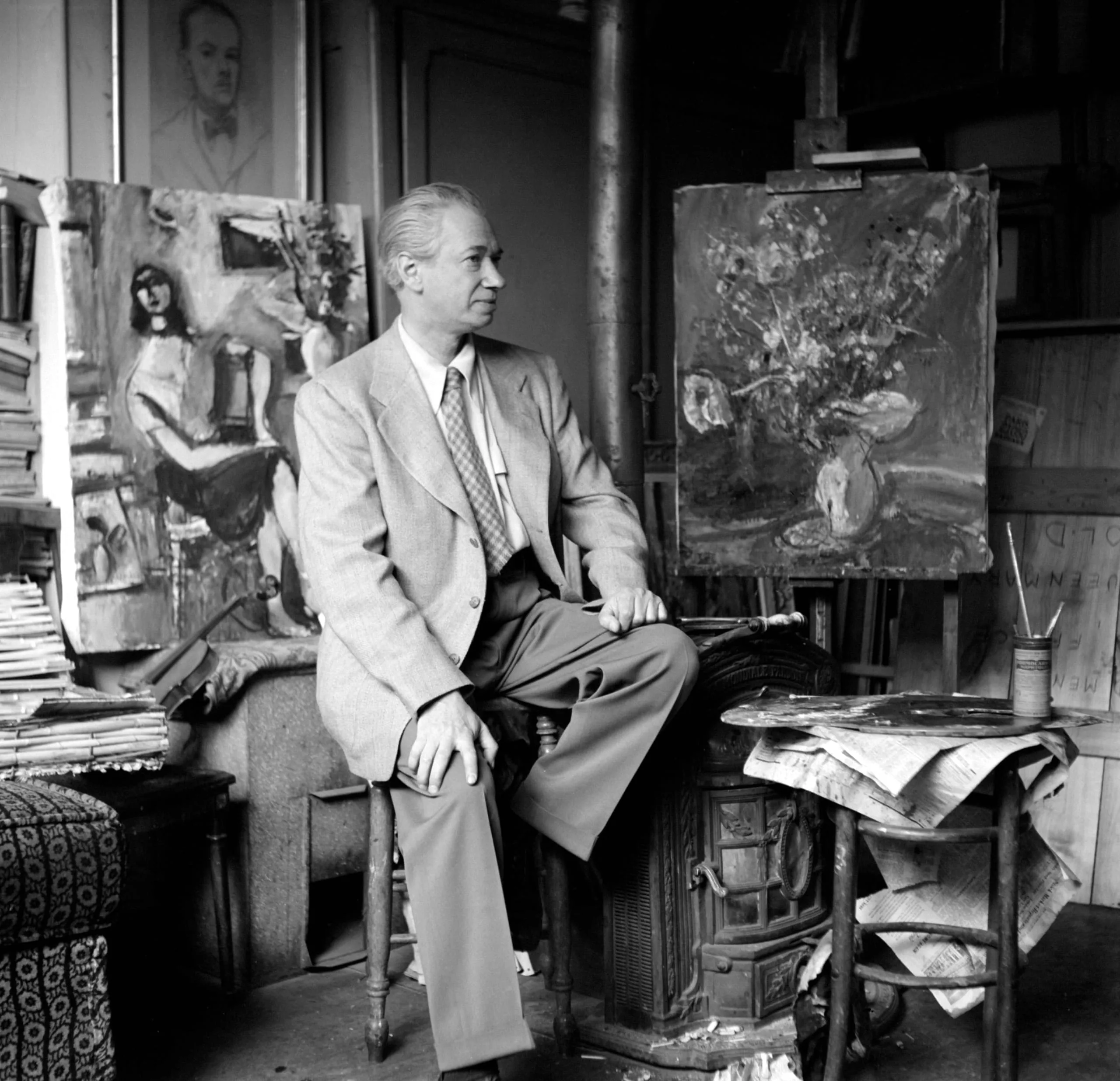 Black and white photograph of a white man in a suit seated in an artist's studio, surrounded by paintings on easels and canvases