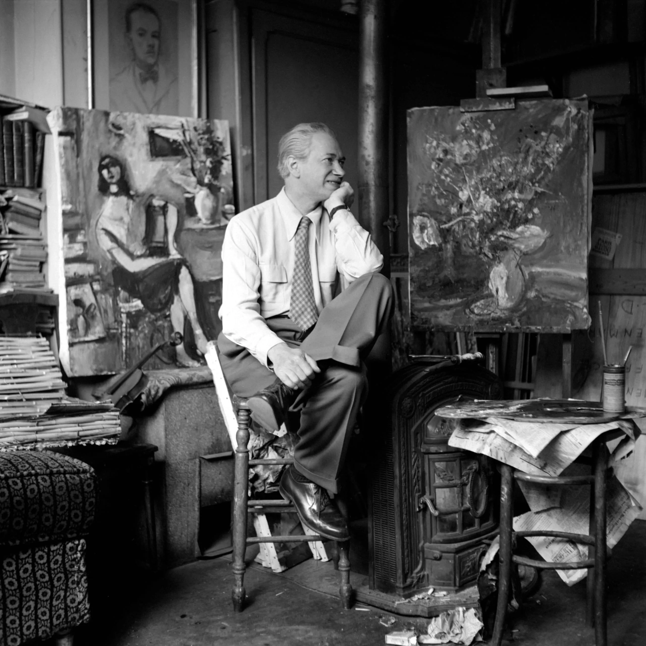 Black and white photograph of a man in a dress shirt and tie seated in a wooden chair inside a cluttered artist's studio, surrounded by paintings and stacked books