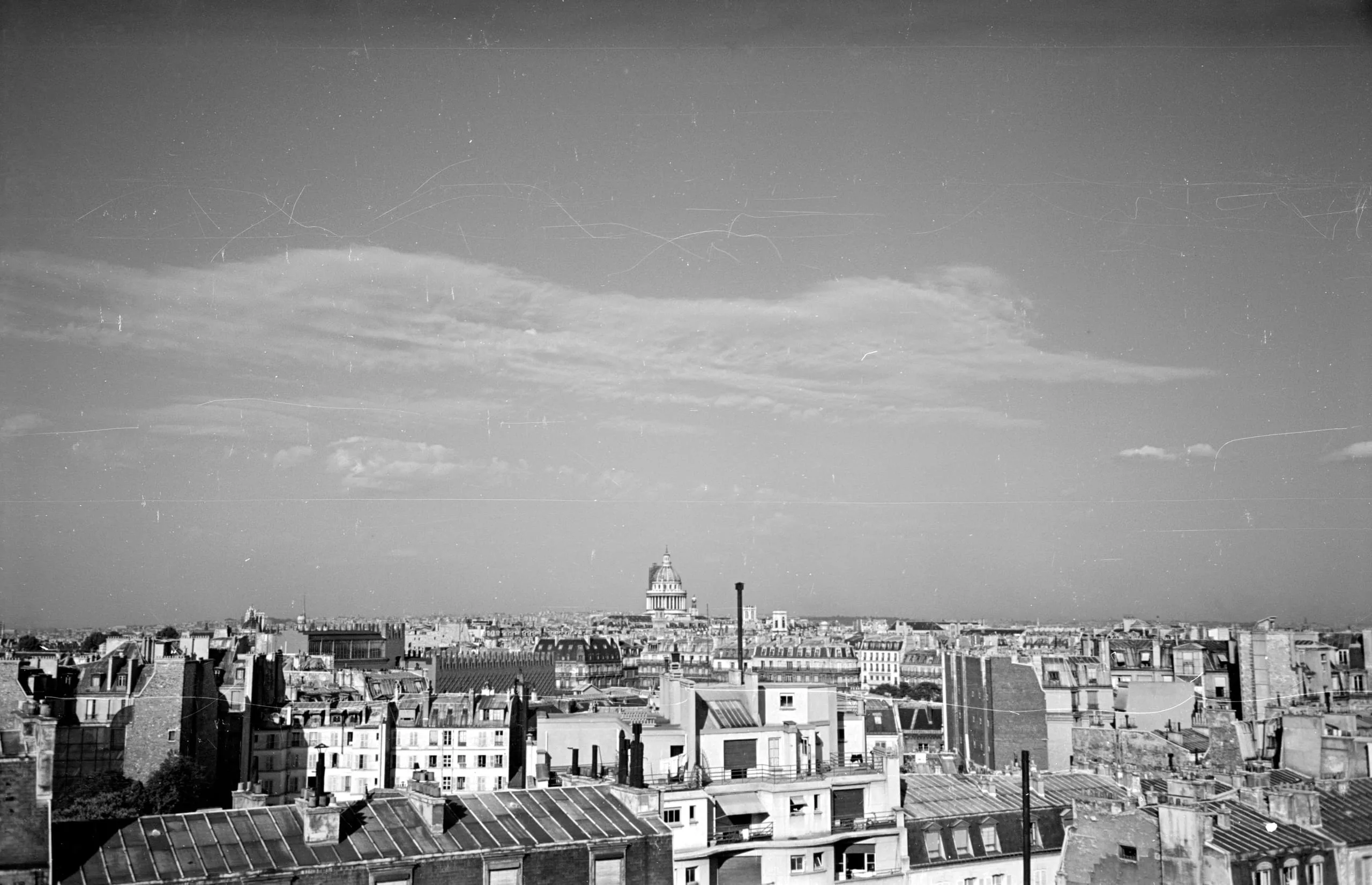 Black and white photograph of a Parisian rooftop panorama with densely packed buildings and a large dome visible in the far distance beneath a wispy clouded sky