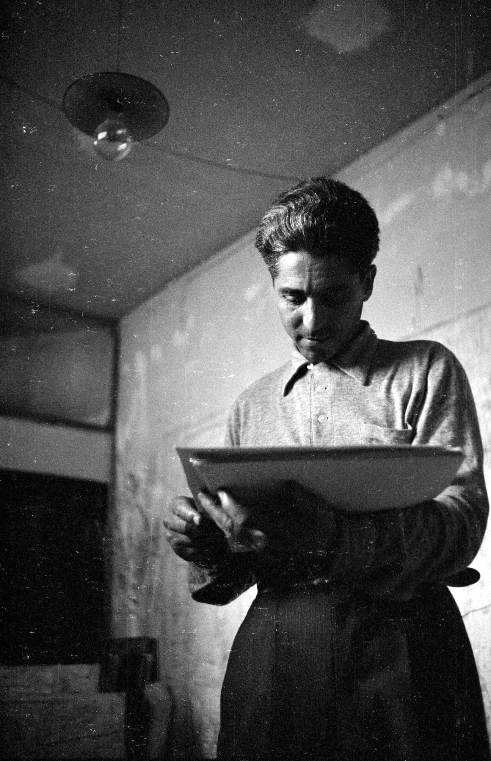 Black and white photograph, a man from the hips up stands in dim indoor light, looking down at a large white tray held in both hands