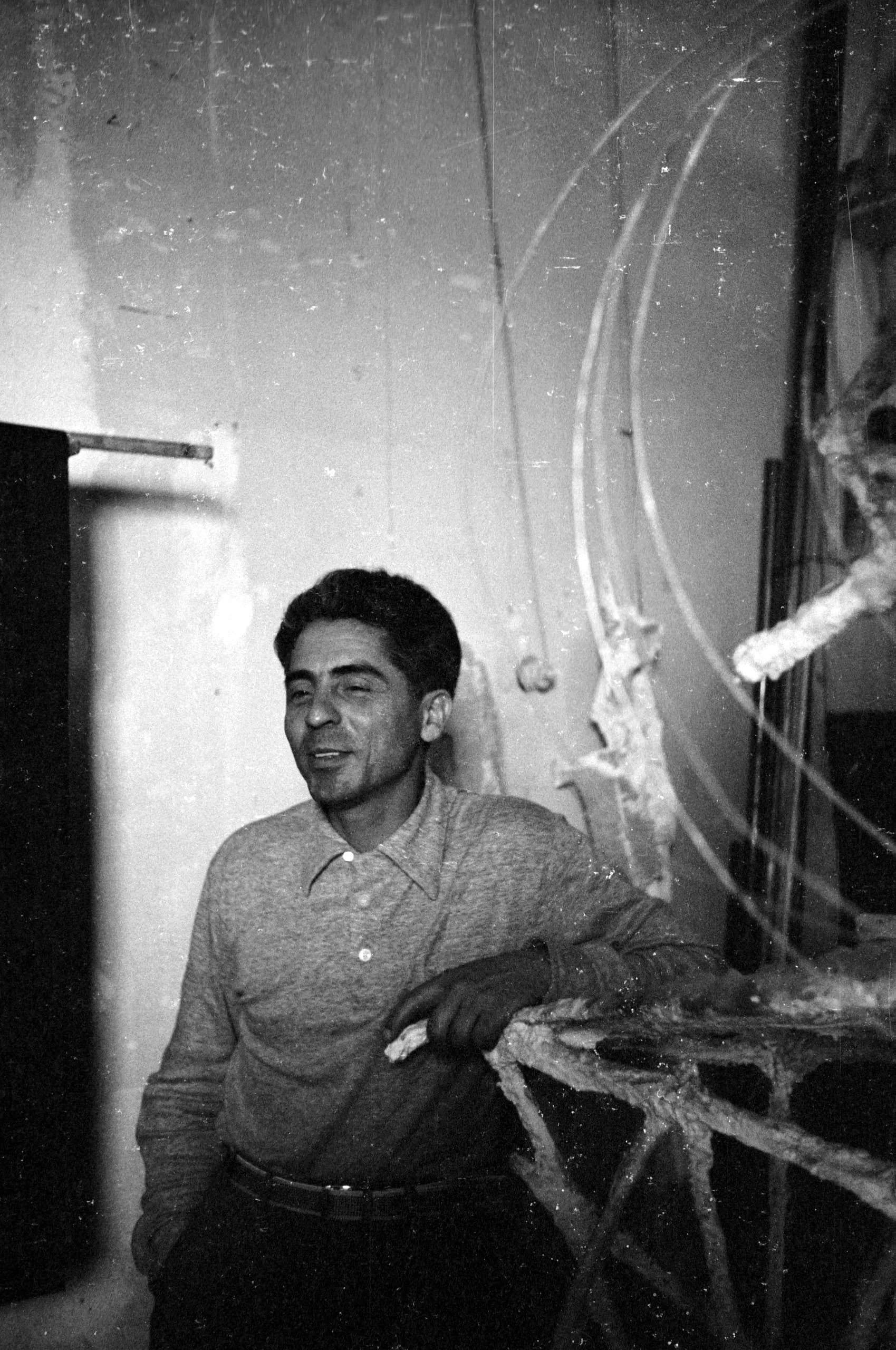 Black and white photograph of a man in a long-sleeved pullover leaning against a branching sculptural structure in a studio, looking to our left