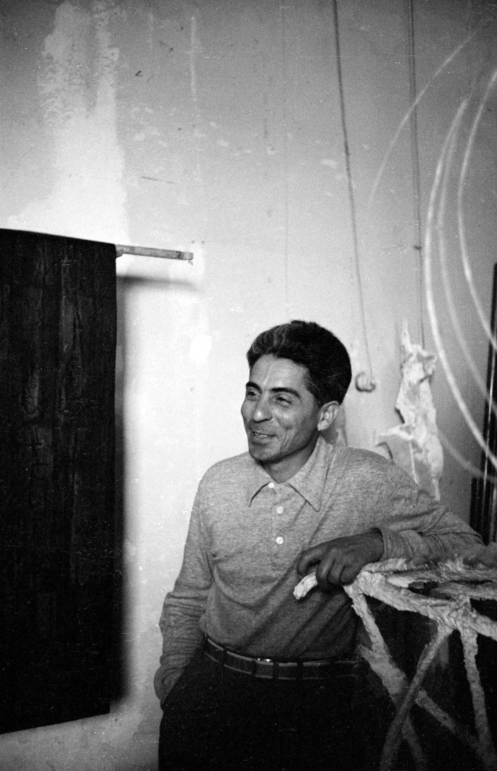 Black and white photograph of a man in a gray pullover shirt standing in an artist's studio, leaning on a plaster sculpture, with a dark canvas visible to our left
