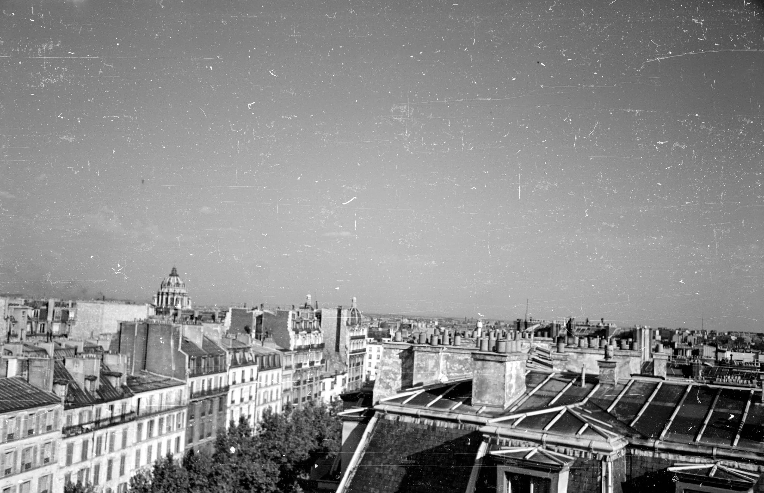 Black and white photograph of a Parisian roofscape viewed from above, with Haussmann-era apartment buildings, a glazed skylight structure, and a large dome rising in the distance