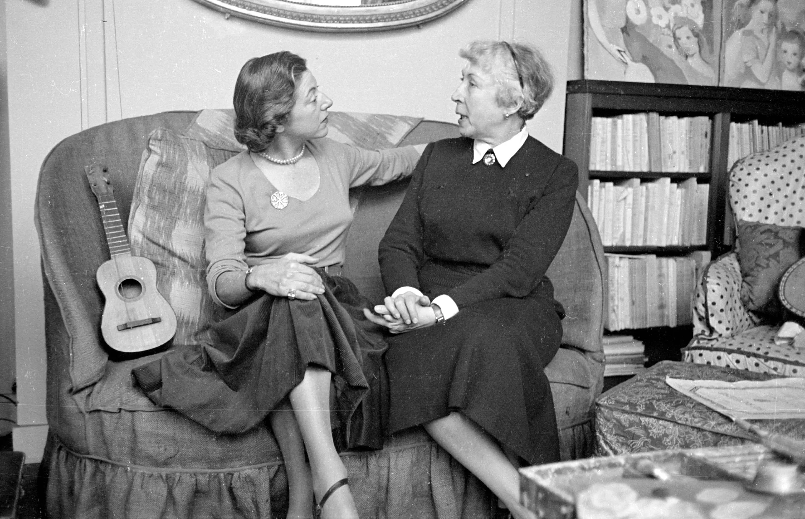 Black and white photograph of two women seated together in an armchair, facing each other, with a ukulele leaning against the chair and bookshelves in the background