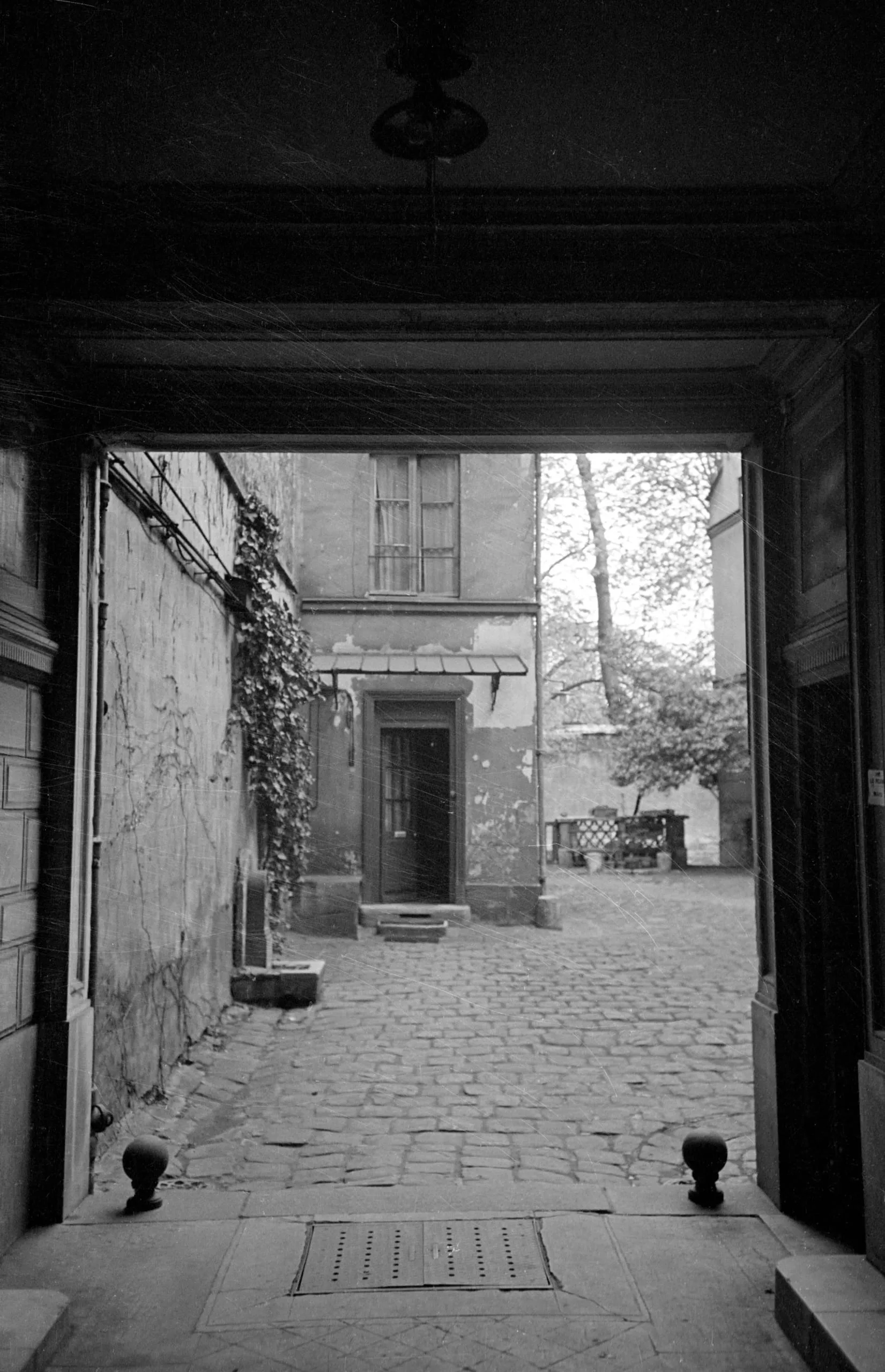 Black and white photograph looking through a dark wooden doorframe onto a cobblestone courtyard, with a weathered ivy-covered wall to the left and a multistory building with a canopied door ahead