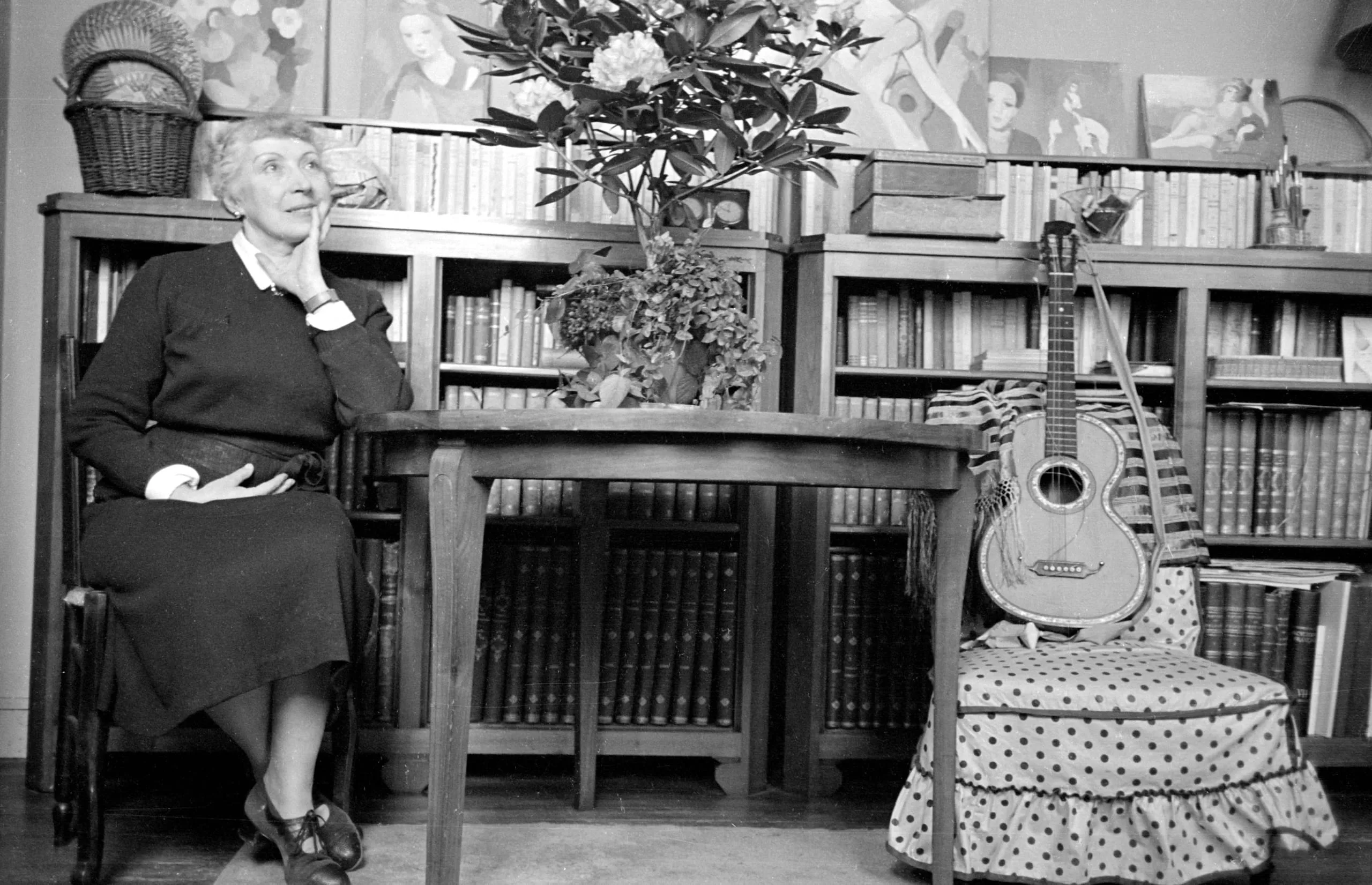 Black and white photograph of an older woman seated at a round table in a book-lined room, chin resting on hand, with a guitar leaning against a polka-dot chair to her right